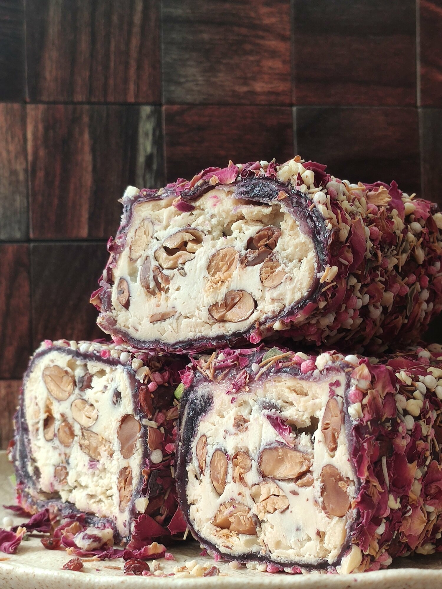 Купить Лукум Турция DELUX 14-Ежевичный с фундучным кремом, миндаль, лепестки роз, кадаиф, барбарис, белый шоколад, фундук 250 гр.