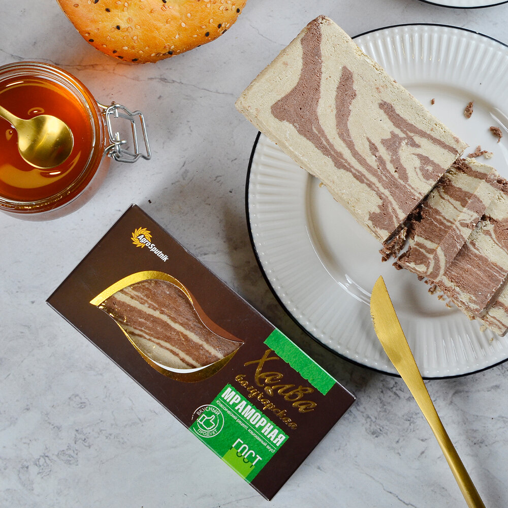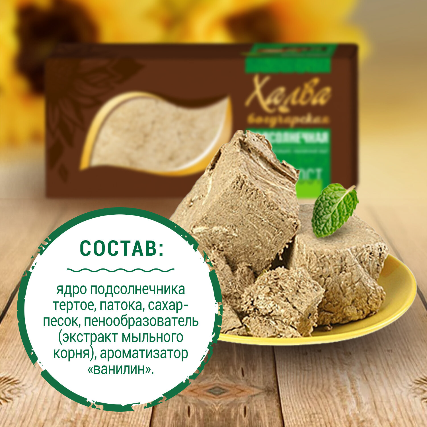 | Состав | Мраморная: Ядро подсолнечника тертое, патока, сахар-песок, какао-порошок, пенообразователь-экстракт мыльного корня, ароматизатор ванилин. Подсолнечная: Ядро подсолнечника тертое, патока, сахар-песок, пенообразователь-экстракт мыльного корня, ароматизатор ванилин. Арахисовая: Ядро арахиса обжаренное, патока, сахар-песок, пенообразователь - экстракт мыльного корня, пищевая соль, ароматизатор «ванилин». |