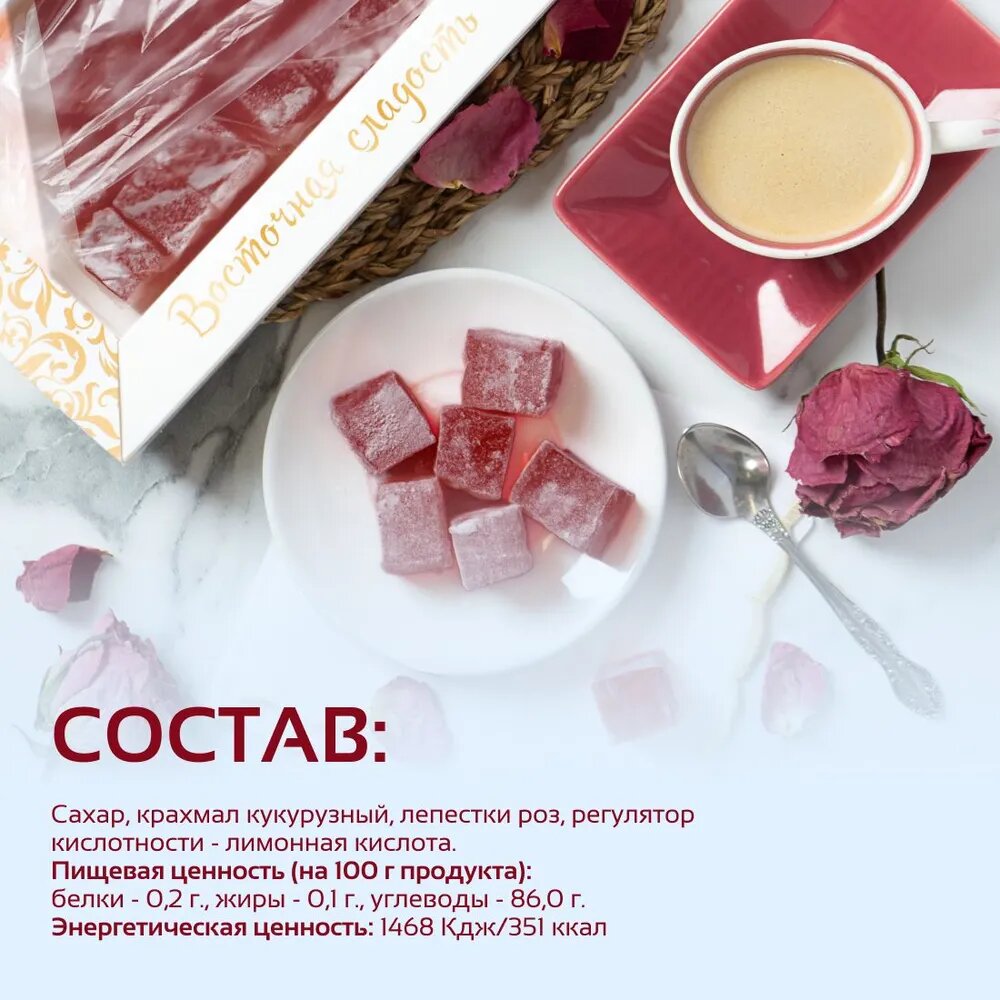 | Состав | Сахар, крахмал кукурузный, лепестки роз, лимонная кислота - регулятор кислотности. Может содержать следы орехов, меда, кунжута, корицы, фрагменты их переработки. |