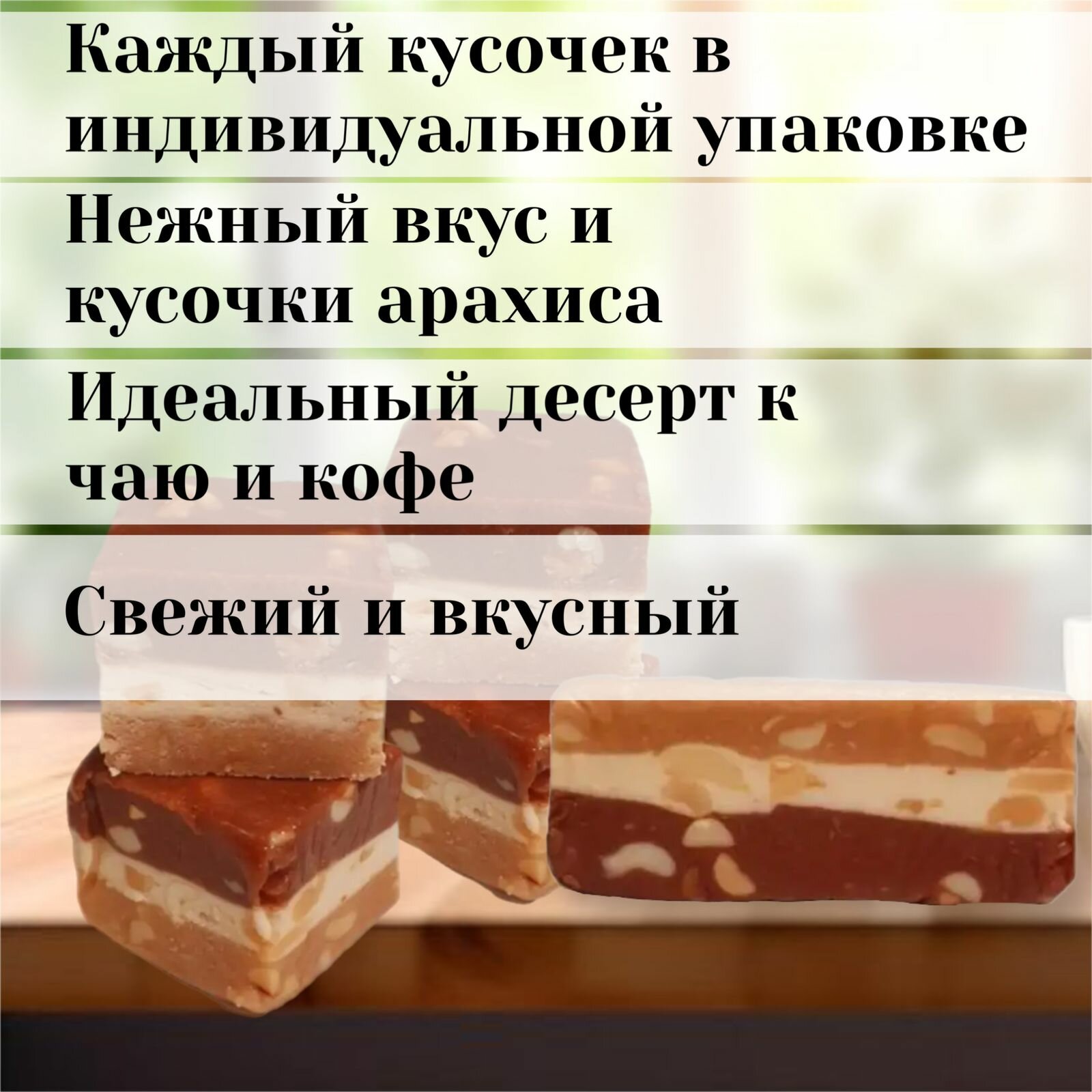 | Состав | Сахар-песок, вода, ядро арахиса жареное, нуга белая, патока, молоко сухое цельное, молоко сгущенное(молоко коровье нормализованное, сахарный сироп, лактоза, консервант сорбиновая кислота),масло сливочное, какао-порошок, ароматизатор идентичный натуральному, ванилин, кислота сорбиновая - консервант. |