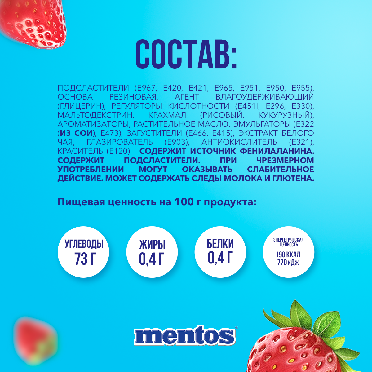 | Состав | ПОДСЛАСТИТЕЛИ (Е967, E420, E421, E965, E951, E950, E955), ОСНОВА РЕЗИНОВАЯ, АГЕНТ ВЛАГОУДЕРЖИВАЮЩИЙ (E422), АРОМАТИЗАТОРЫ, МАЛЬТОДЕКСТРИН, РЕГУЛЯТОР КИСЛОТНОСТИ (E451i), КРАХМАЛ (РИСОВЫЙ, КУКУРУЗНЫЙ), ЭКСТРАКТ БЕЛОГО ЧАЯ, ЭМУЛЬГАТОРЫ (Е473, Е322), ЗАГУСТИТЕЛИ (E466, E415), РАСТИТЕЛЬНОЕ МАСЛО, ГЛАЗИРОВАТЕЛЬ (E903), КРАСИТЕЛИ (Е133, Е100), АНТИОКИСЛИТЕЛЬ (Е321). СОДЕРЖИТ СОЕВЫЙ ЛЕЦИТИН. СОДЕРЖИТ ИСТОЧНИК ФЕНИЛАЛАНИНА |