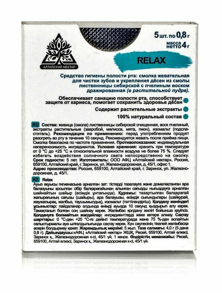 | Состав | живица (смола) лиственницы сибирской очищенная, воск пчелиный, экстракты растительные (зверобой, мелисса, мята, пион), изомальт (подсластитель) |