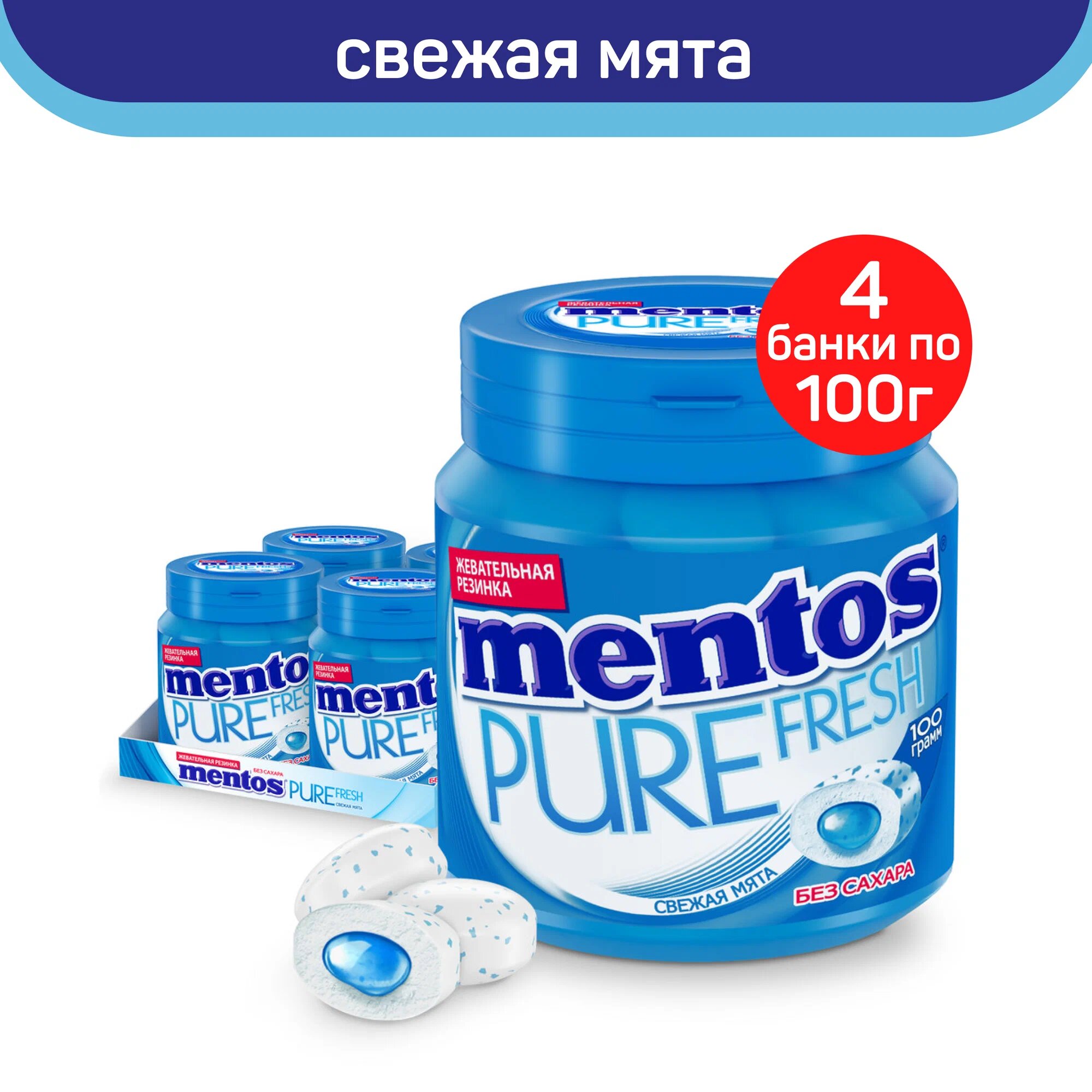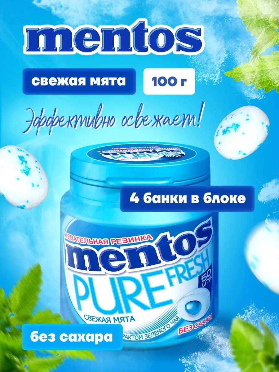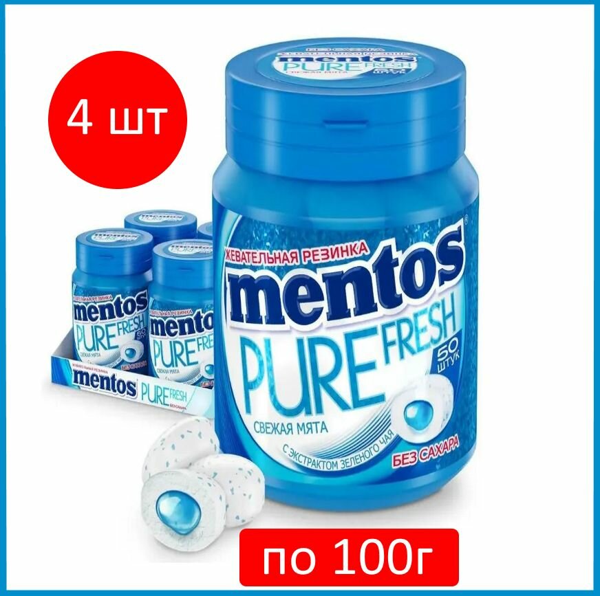Жевательная резинка Mentos Pure Fresh, вкус Свежая мята, 4 шт по 100 г