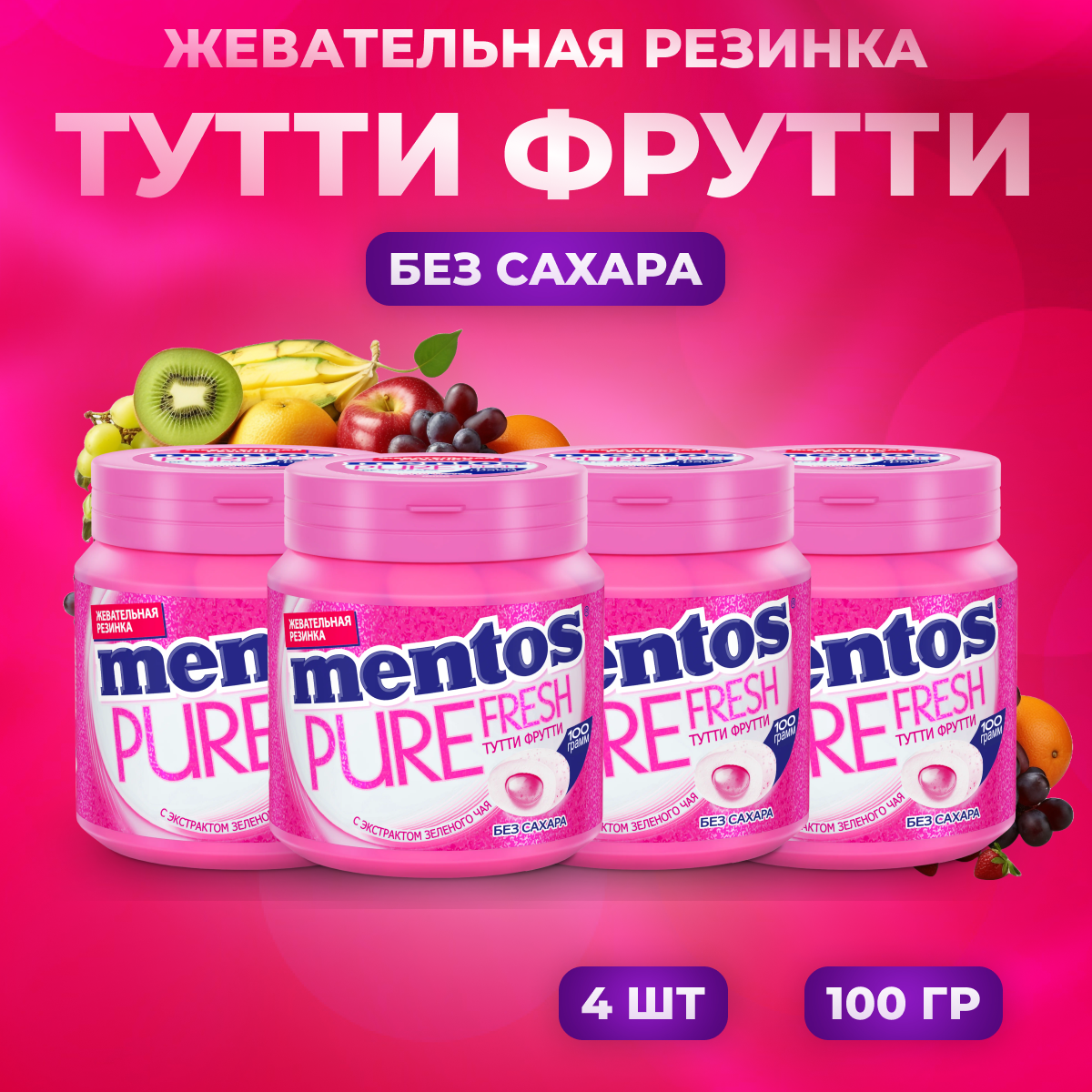 Mentos Жевательная резинка Pure Fresh Тутти-Фрутти 4 шт по 100 г