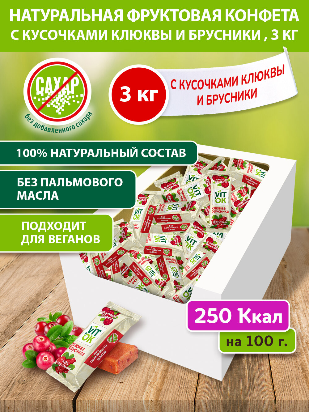 Конфета-батончик фрyктовая Vitok 100% натуральная полезная без сахара с яблочным пюре, клюквой и брусникой, 3 кг