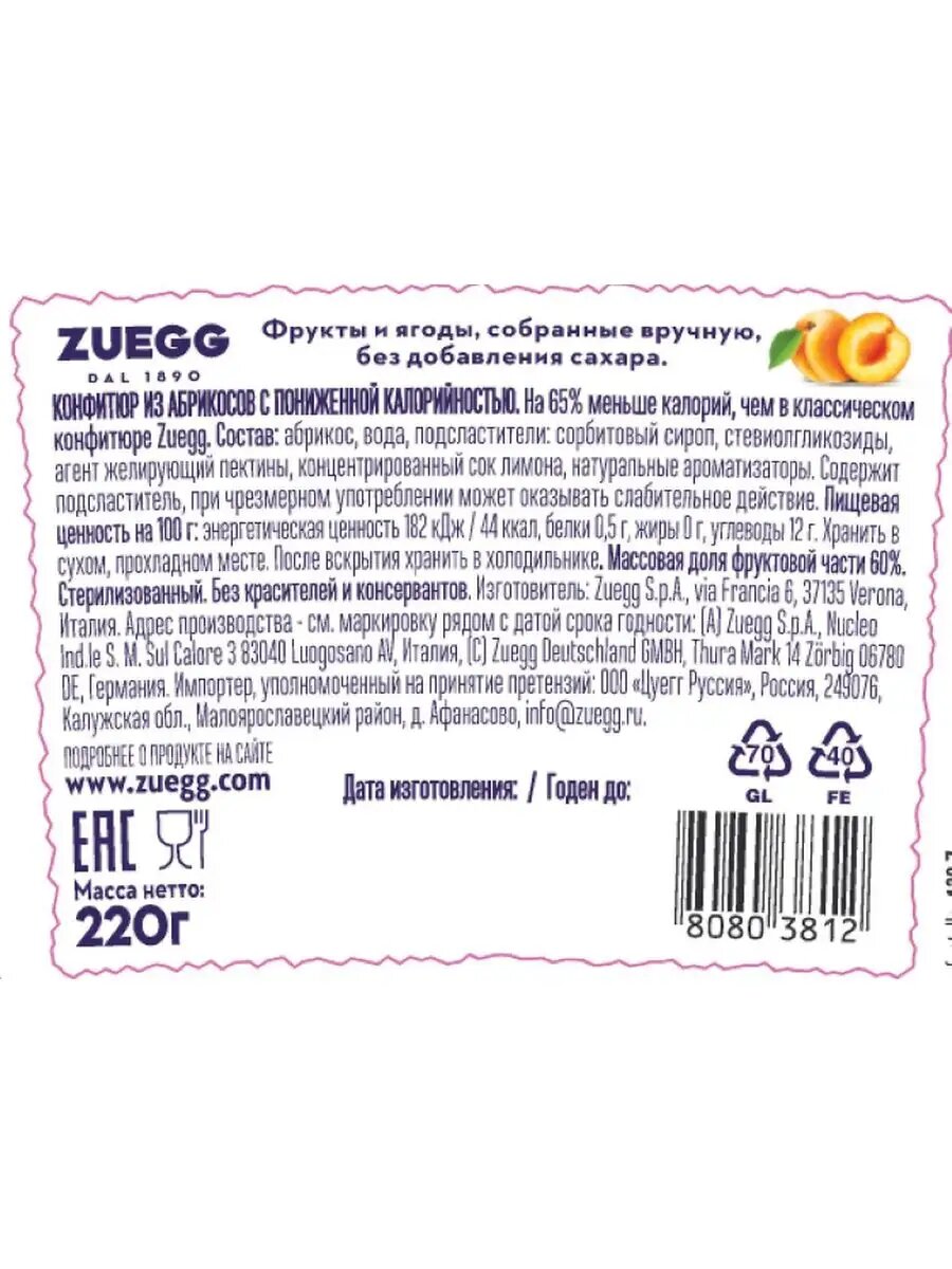 Конфитюр Zuegg без сахара Абрикос, 220 г