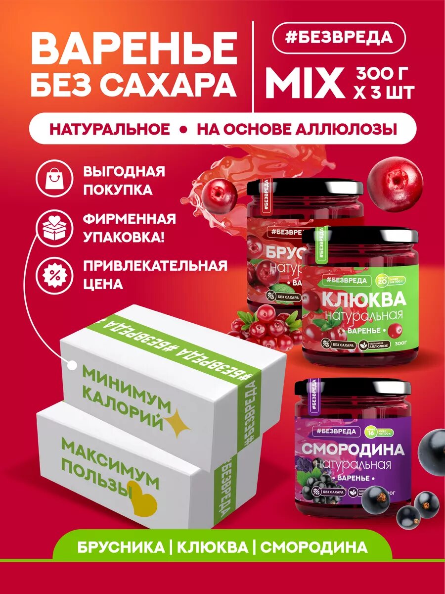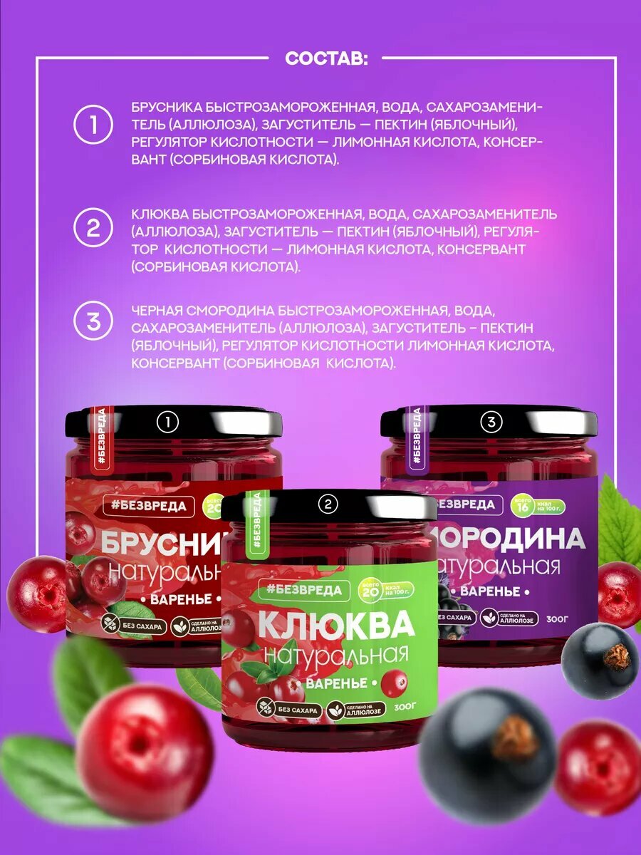 Варенье без сахара "безвреда" набор из брусники, клюквы, смородины 3*300 гр. / варенье без сахара