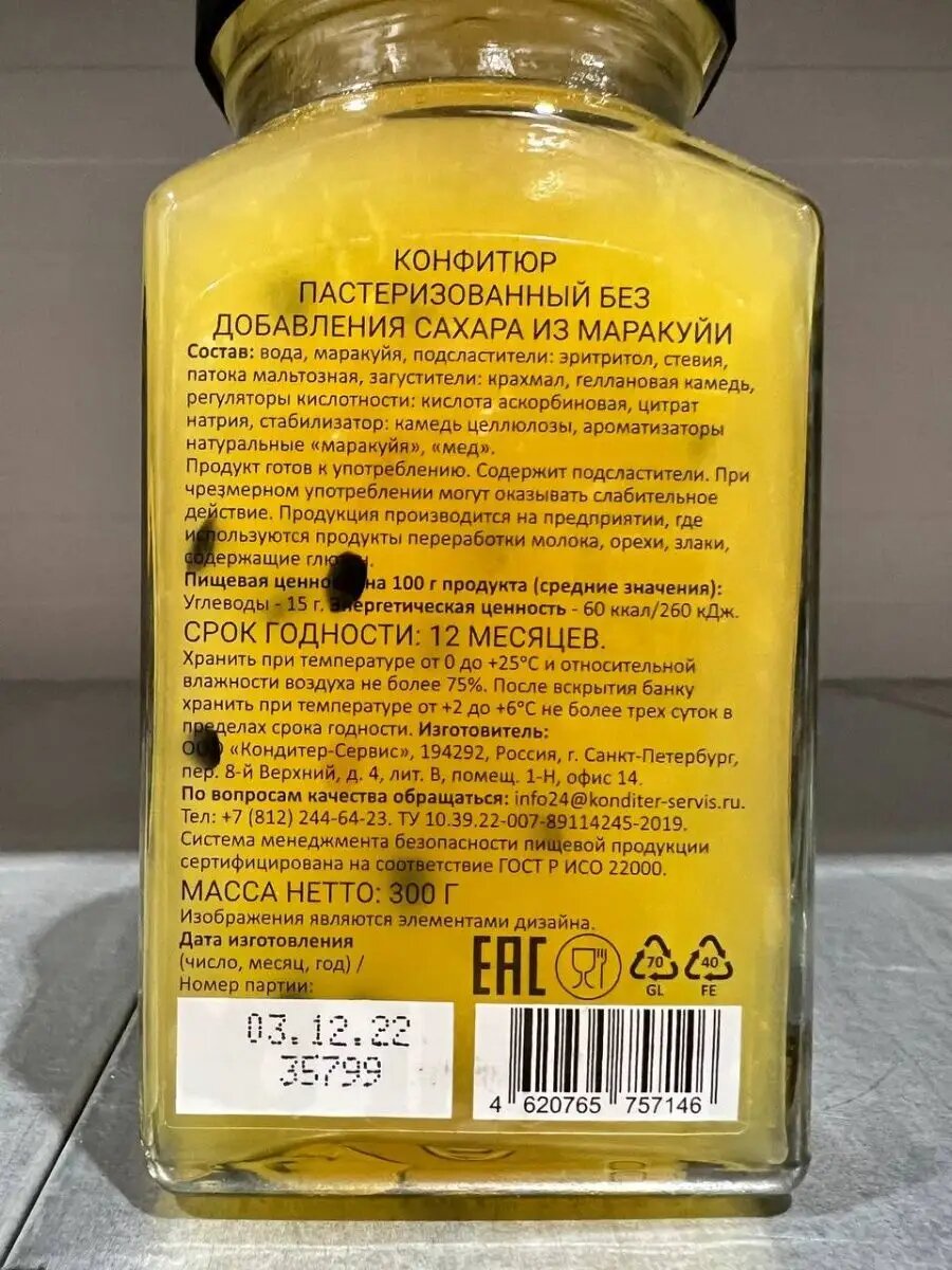 | Состав | маракуйя, вода, подсластители (эритритол, стевия), загустители (Е1442, геллановая камедь), регулятор кислотности (аскорбиновая кислота, цитрат натрия), ароматизаторы («маракуйя», «мед») |