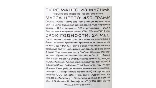 Манго из Мьянмы (пюре) 430 г, ж/б (без сахара)