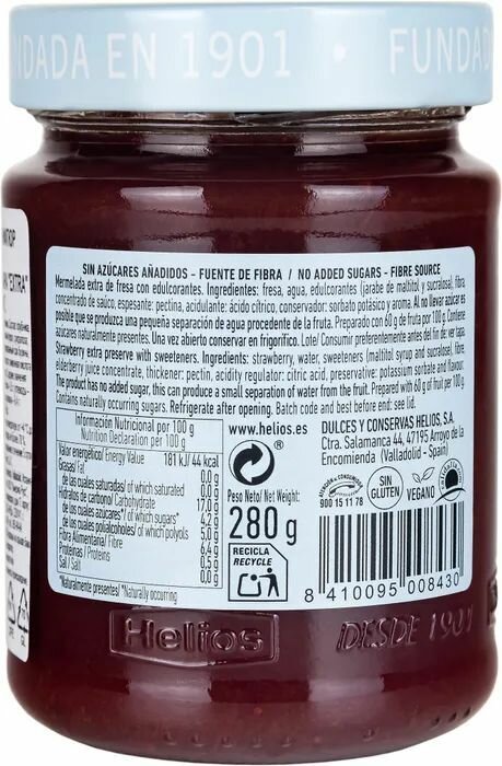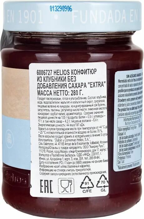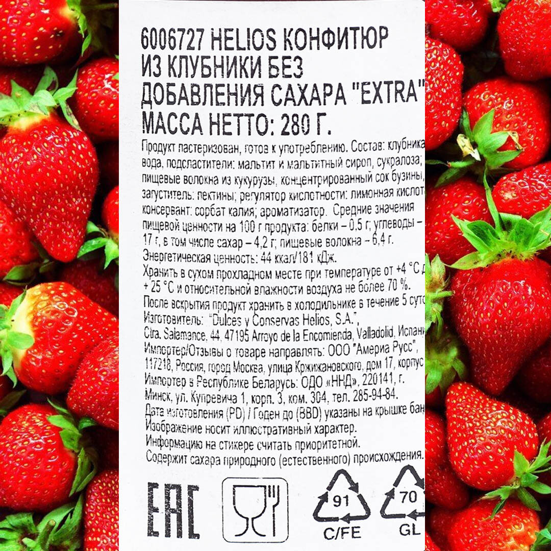 Купить Конфитюр HELIOS из клубники без добавления сахара, низкоуглеводный Extra, 280г