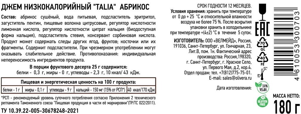 Джем zero без сахара низкокалорийный "Talia" абрикос, 180гр интересное: