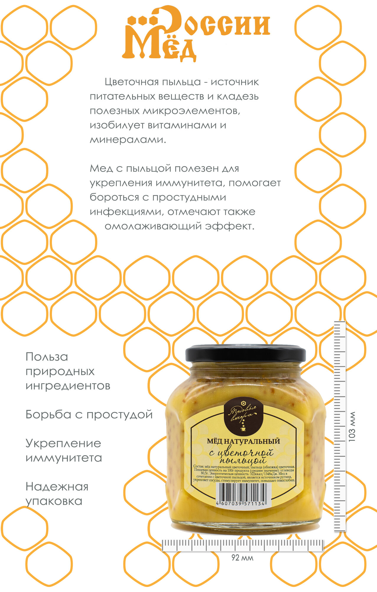 | Состав | мед натуральный с цветочной пыльцой |