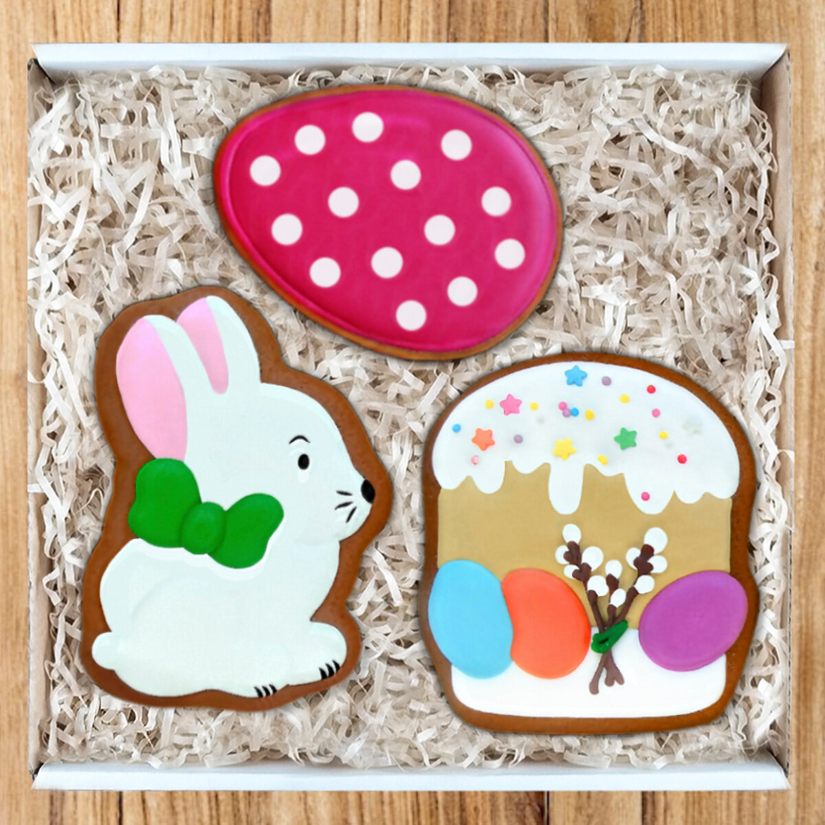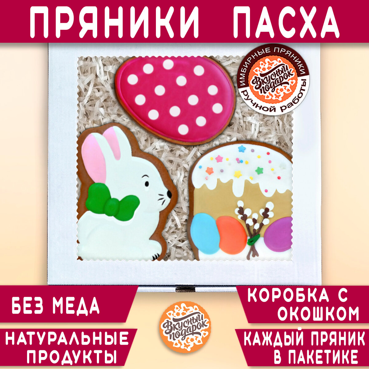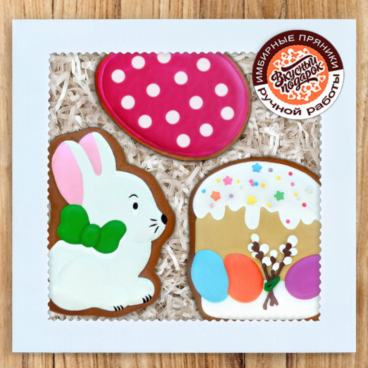 Купить Подарочный набор пасхальных пряников имбирных ручной работы в подарок на Пасху детям, женщине, мужчине "Пасхальный кролик, кулич и яйцо" 18х18 см
