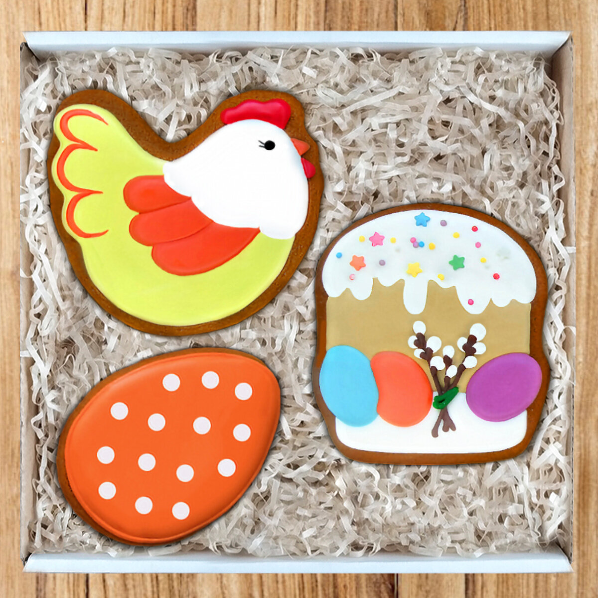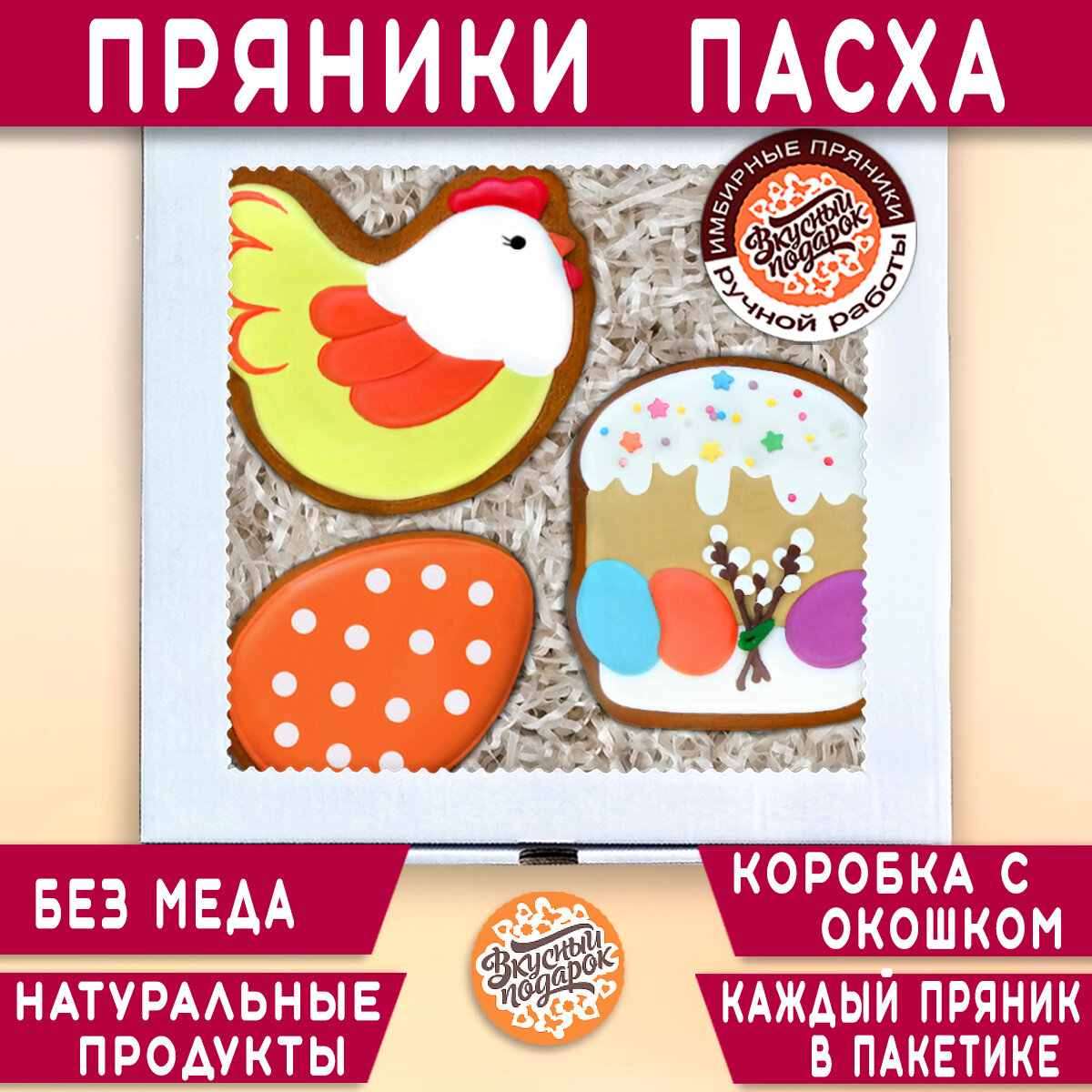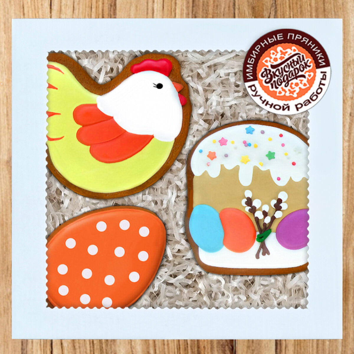 Купить Подарочный набор пасхальных пряников имбирных ручной работы в подарок на Пасху детям, женщине, мужчине "Кулич, курочка и пасхальное яйцо" 18х18 см