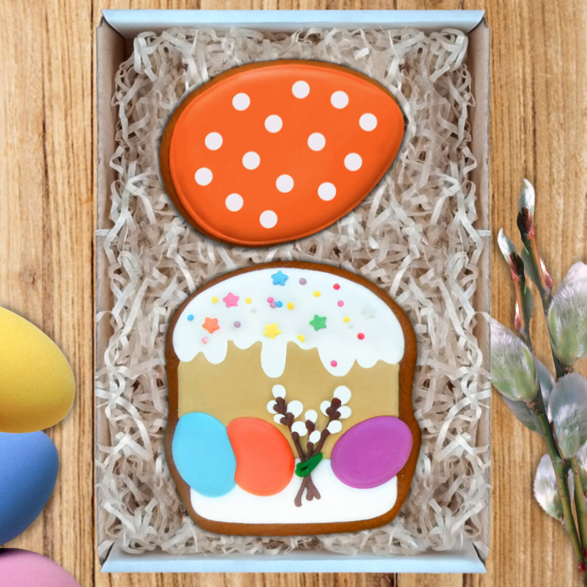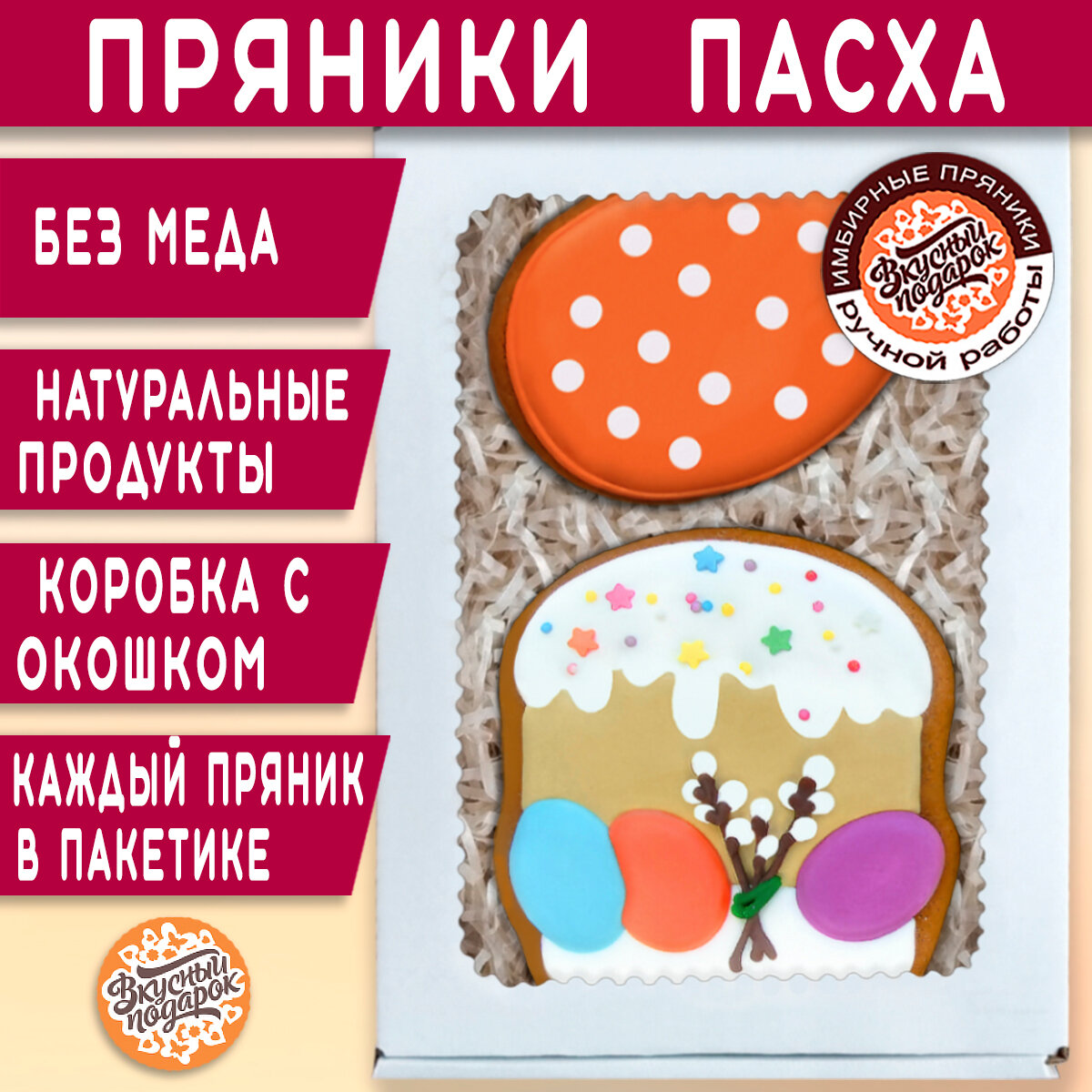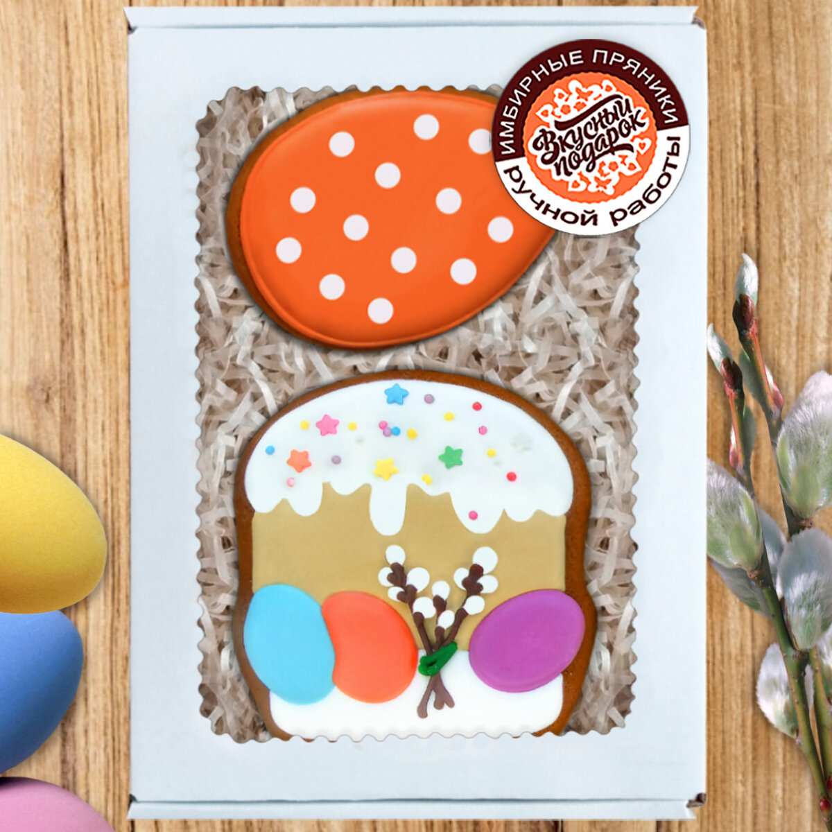 Подарочный набор пасхальных пряников имбирных ручной работы в подарок на Пасху детям, женщине, мужчине "Кулич и пасхальное яйцо оранжевое" 18х12 см интересное:
