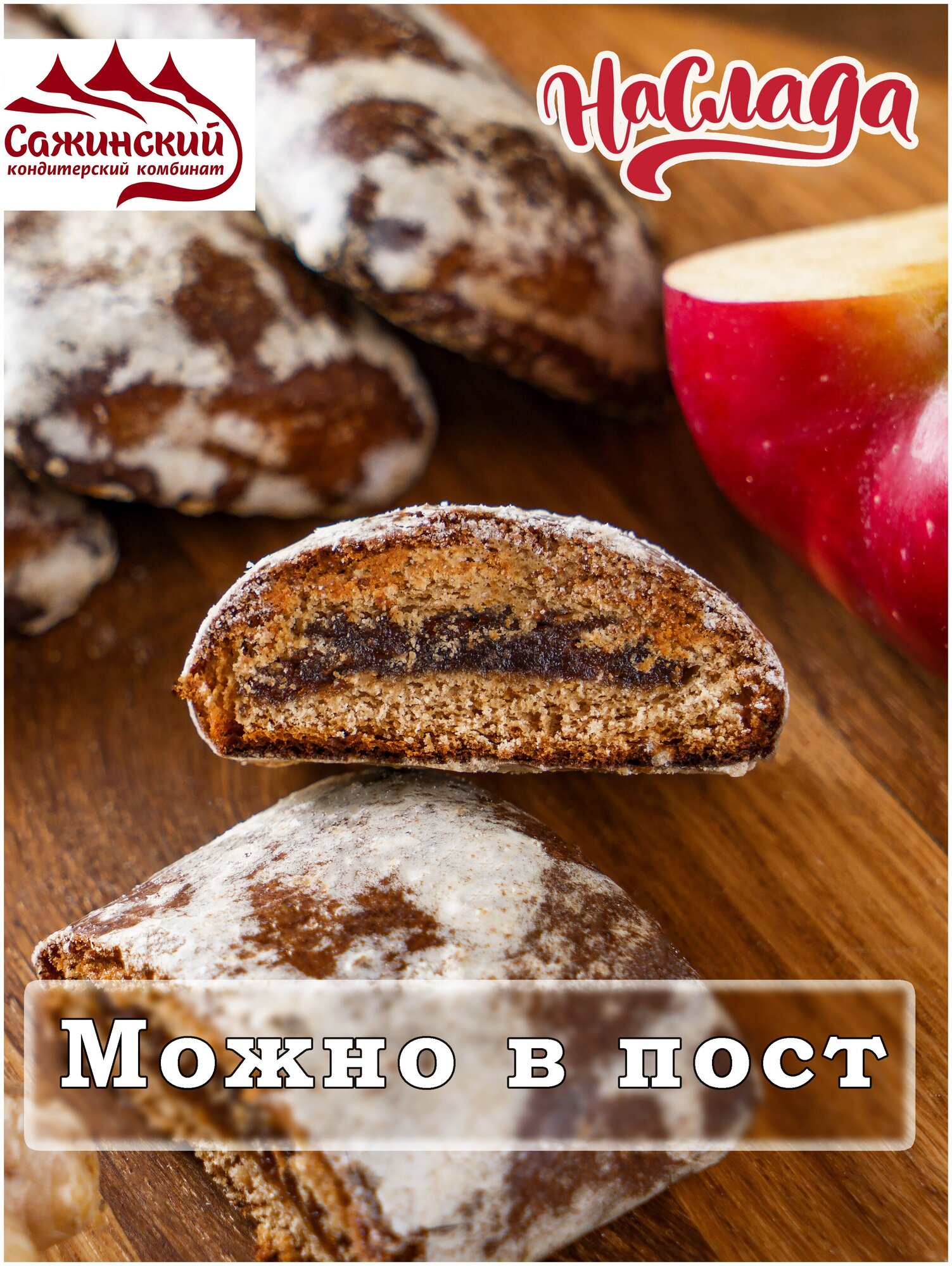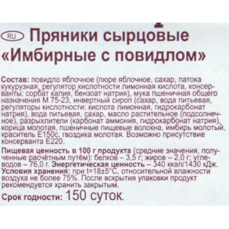 | Состав | повидло яблочное (пюре яблочное, патока кукурузная, сахар-песок, регулятор кислотности лимонная кислота, консервант сорбиновая кислота), мука пшеничная общего назначения М-75-23, инвертный сироп (сахар-песок, вода, регуляторы кислотности: кислота лимонная, гидрокарбонат натрия), вода, сахар-песок,масло подсолнечное рафинированное дезодорированное, разрыхлители (карбонат аммония,гидрокарбонат натрия), корица молотая, пшеничные пищевые волокна, гвоздика молотая, имбирь молотый, краситель сахарный колер III |
