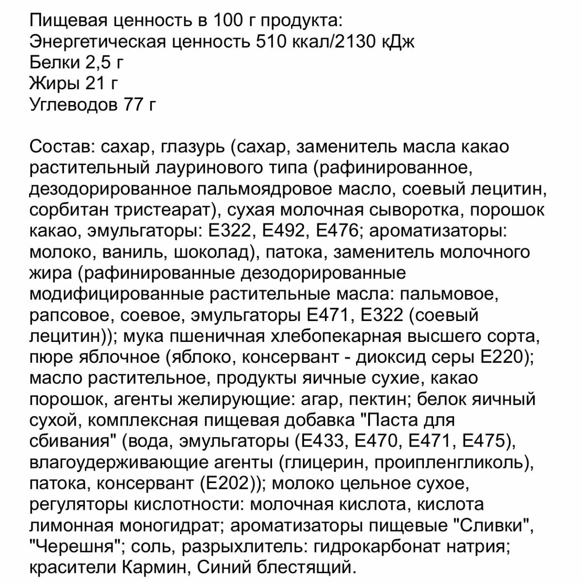 | Состав | Сахар, патока, маргарин для кремов (масла растительные рафинированные дезодорированные, в том числе переэтерифицированные: пальмовое и его фракции, подсолнечное, кокосовое, вода, эмульгаторы ( моно- и диглицериды жирных кислот, эфиры полиглицеридов и жирных кислот), консервант (сорбат калия), регулятор кислотности (лимонная кислота), ароматизатор, красители (Куркумин, Экстракт аннато)), гидрогенизированный растительный жир (полностью гидрогенизированный растительный жир, эмульгатор (сорбитан тристереат, ЛЕЦИТИН СОЕВЫЙ)), МУКА ПШЕНИЧНАЯ хлебопекарная высшего сорта, пюре яблочное (яблоко, консервант - диоксид серы), СЫВОРОТКА МОЛОЧНАЯ СУХАЯ, масло растительное, какао-порошок, глазурь кондитерская (сахар, заменитель масла какао лауринового типа (гидрогенизированное пальмоядровое масло, эмульгаторы лецитин, сорбитан тристеарат), эмульгаторы (мальтодекстрин, лецитин, сорбитан тристеарат, эфиры полиглицерина и взаимоэтерифицированных рициноловых кислот), СЫВОРОТКА МОЛОЧНАЯ СУХАЯ. |