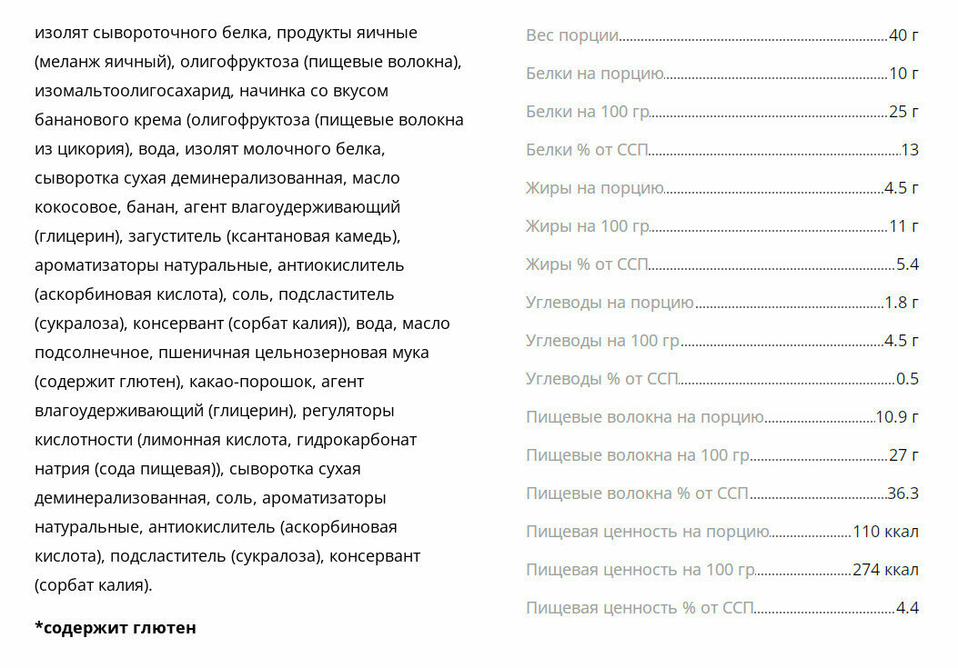 | Не содержит | ГМО / ароматизаторы / глютен / загустители / консерванты / пшеничную муку / сахар / яйца |