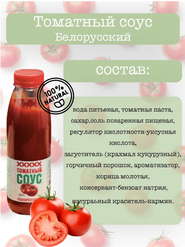 | Состав | Вода питьевая, томатная паста, сахар, соль поваренная пищевая, регулятор кислотности - уксусная кислота, загуститель (крахмал кукурузный), горчичный порошок, ароматизатор, корица молотая, консервант - собрат калия, натуральный краситель -кармин. |
