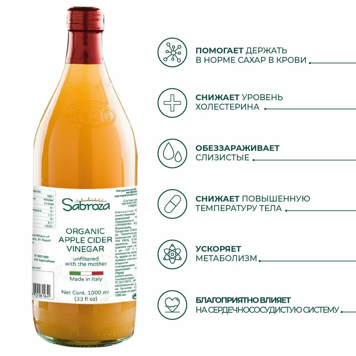 1 литр, Яблочный Уксус Натуральный Нефильтрованный, Непастеризованный, из Италии, Sabroza, c уксусной маткой, ПЭТ бутылка
