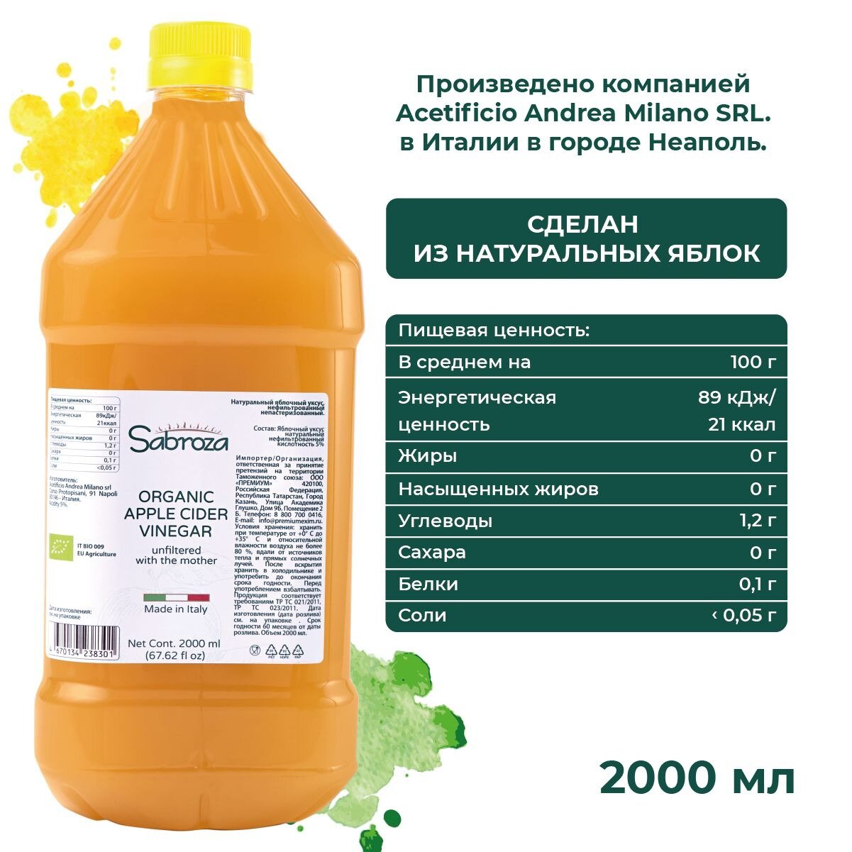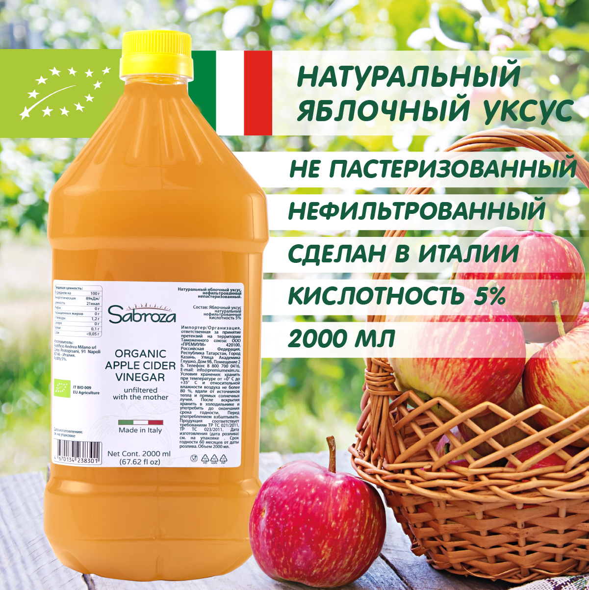 1 литр, Яблочный Уксус Натуральный Нефильтрованный, Непастеризованный, из Италии, Sabroza, c уксусной маткой, ПЭТ бутылка