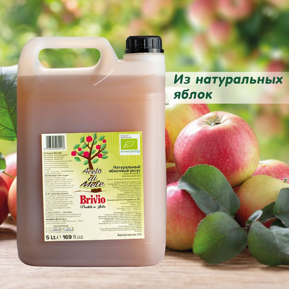 Купить Яблочный Уксус Натуральный, Нефильтрованный, с уксусной маткой 5 Литров