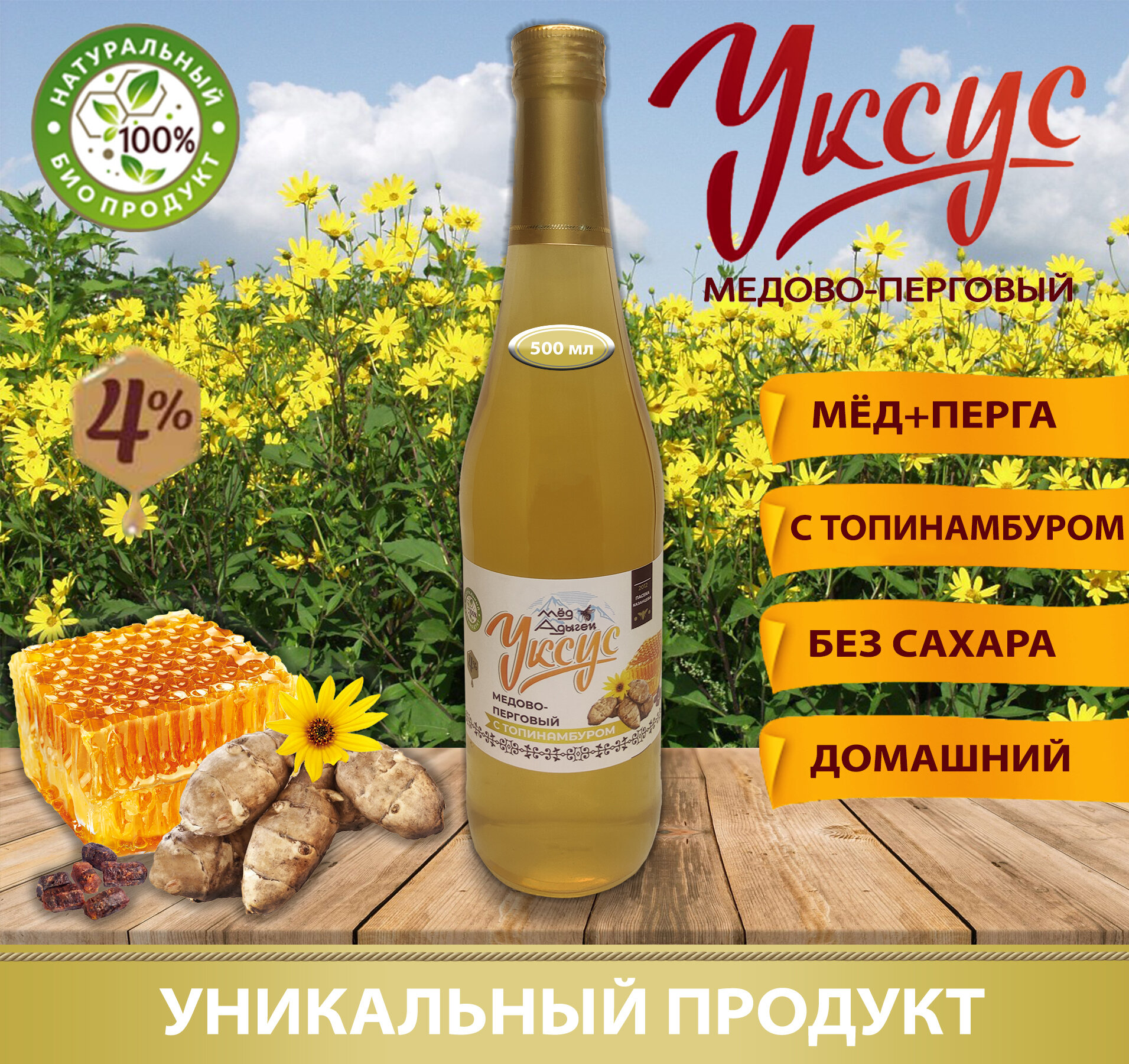Уксус натуральный медово-перговый с Топинамбуром Микомель, не фильтрованный, не пастеризованный 4% Вкусы Адыгеи 500 мл интересное: