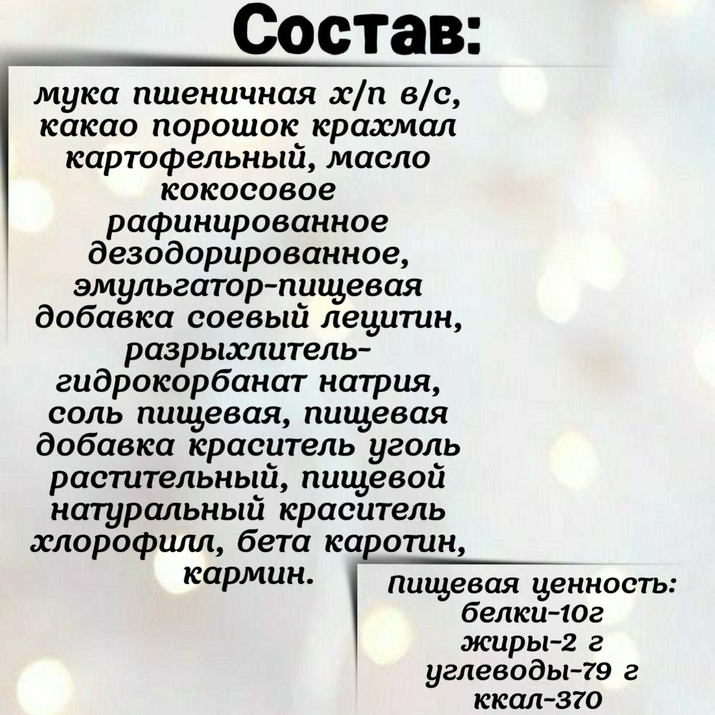 | Состав | мука пшеничная х/п в/с, какао порошок крахмал картофельный, масло кокосовое рафинированное дезодорированное, эмульгатор-пищевая добавка соевый лецитин, разрыхлитель-гидрокорбанат натрия, соль пищевая, пищевая добавка краситель уголь растительный, пищевой натуральный краситель хлорофилл, бета каротин, кармин. |