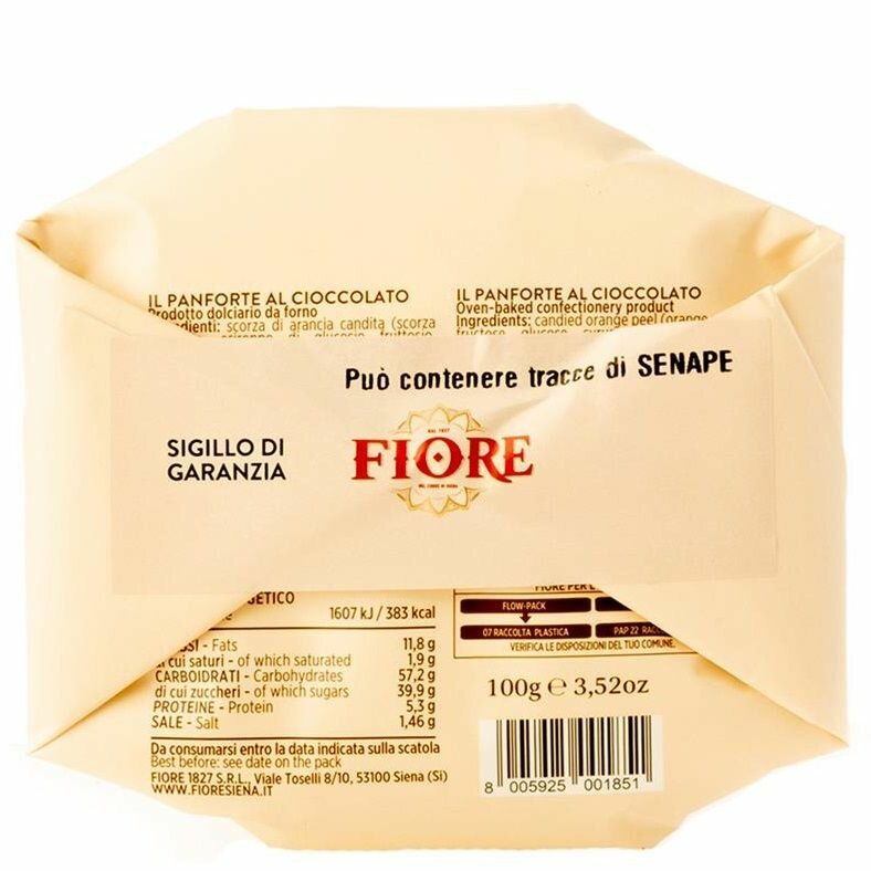 | Состав | Цукаты апельсина, цукаты дыни, миндаль, сахар, мука пшеничная, шоколад, какао-порошок, вафля, специи, ванилин. Секретный рецепт, который семья Фиоре хранит с 1827 года. |
