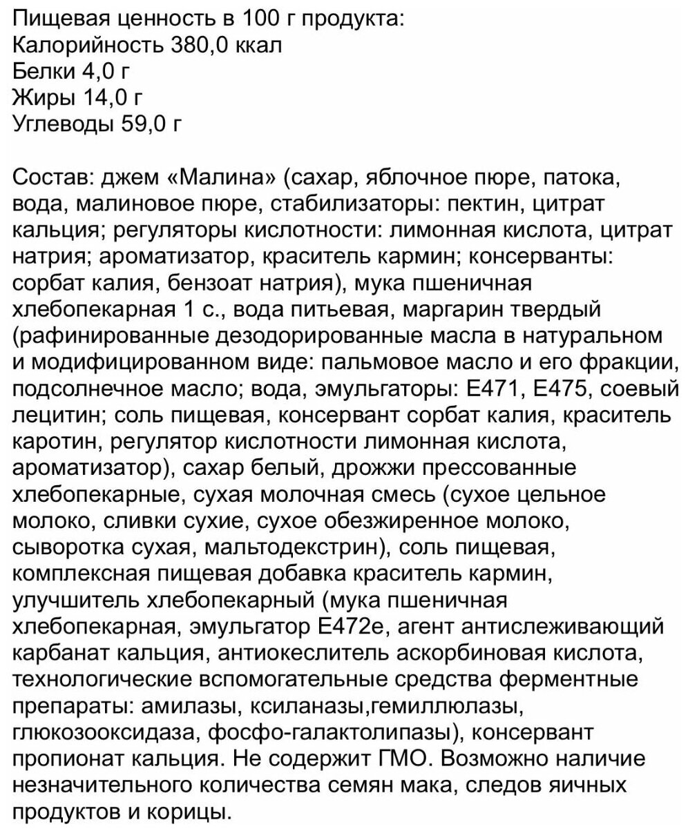 | Состав | мука пшеничная, малиновый джем, жиры растительные, дрожжи, соль, ванилин |