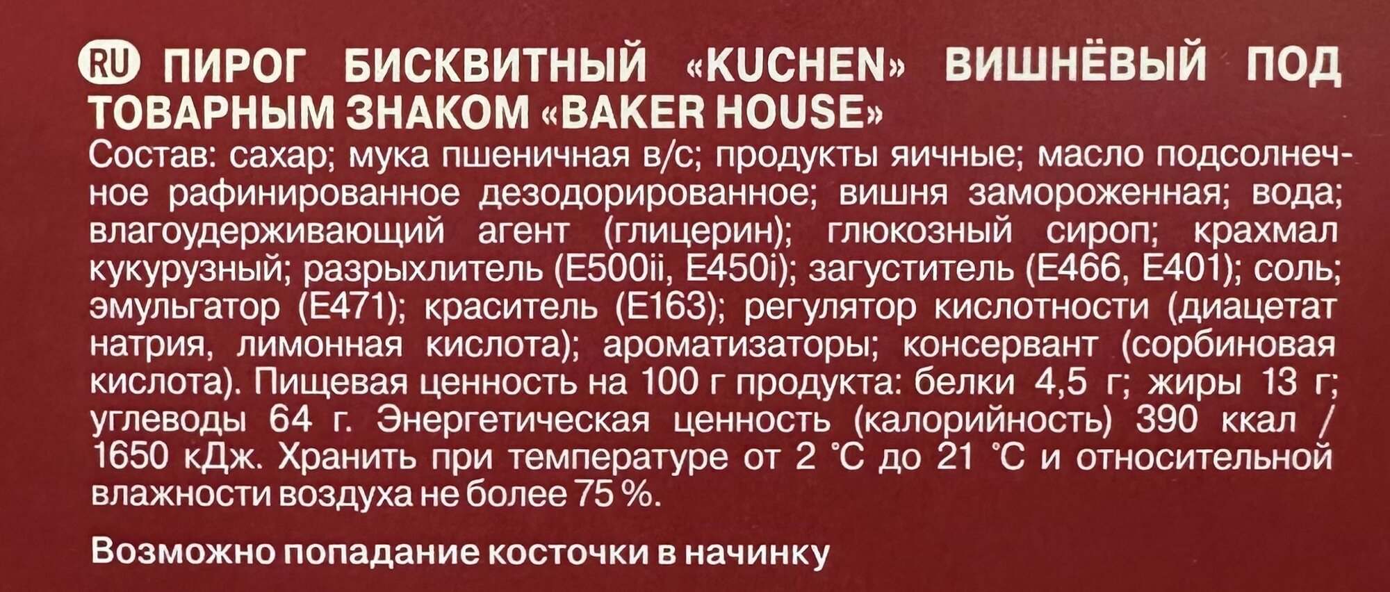 | Состав | сахар; мука пшеничная в/с; продукты яичные; масло подсолнечное рафинированное дезодорированное; вишня замороженная; вода; влагоудерживающий агент (глицерин); глюкозный сироп; крахмал кукурузный; разрыхлитель (Е500ii, Е450i); загуститель (Е466, Е401); соль; эмульгатор (Е471); краситель (Е163); регулятор кислотности (диацетат натрия, лимонная кислота); ароматизаторы; консервант (сорбиновая кислота). |