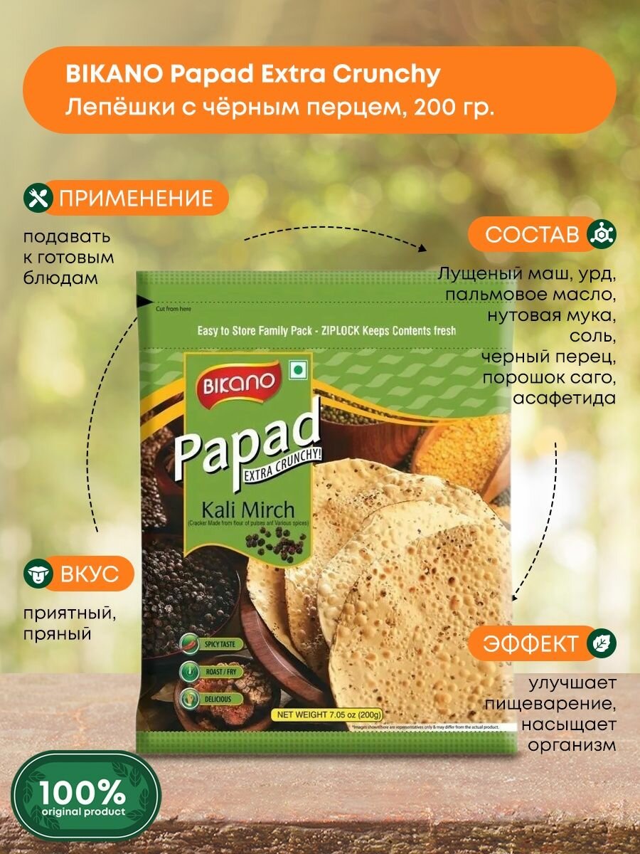 Extra Crunchy PAPAD KALI MIRCH, Bikano (Хрустящие лепёшки папад С чёрным перцем, Бикано), 200 г. интересное: