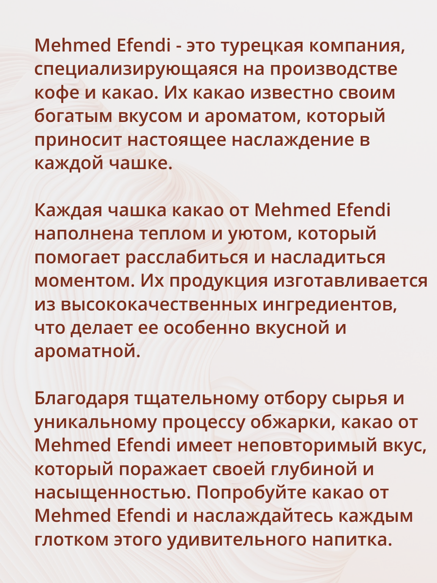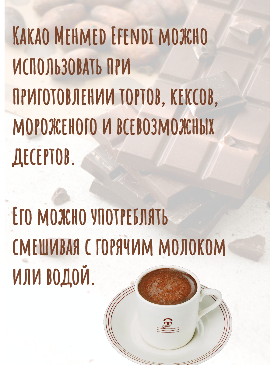 | Стандарты производства | НЕ СЛАДКИЙ КАКАО-ПОРОШОК от МЕХМЕТА ЭФЕНДИ Компания Kurukahveci Mehmet Efendi занимается обжаркой кофе с 1871 года. Сегодня это крупнейшая и старейшая кофейная компания в Турции. Теперь она представляет восхитительный какао-порошок для выпечки, тортов, мороженого и других десертов, а также в качестве напитка с молоком или водой. |
