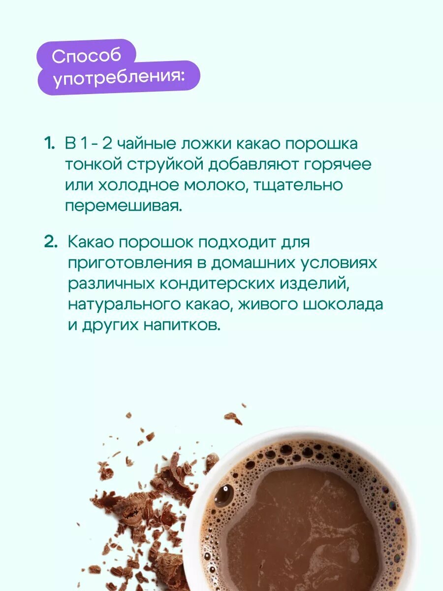 | Способ приготовления | в 1-2 чайные ложки какао порошка тонкой струйкой добавляют горячее или холодное молоко, тщательно перемешивая; какао порошок подходит для приготовления в домашних условиях различных кондитерских изделий, натурального какао, живого шоколада и других напитков |