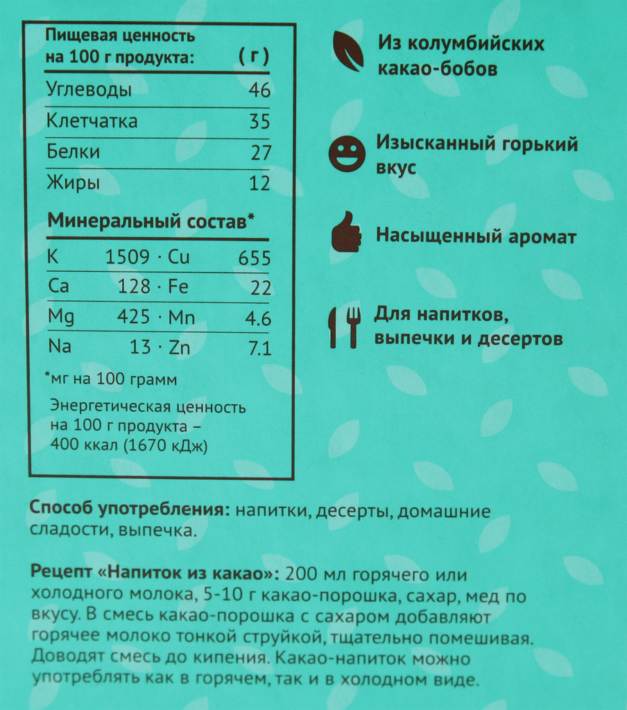 | Способ приготовления | в 1-2 чайные ложки какао порошка тонкой струйкой добавляют горячее или холодное молоко, тщательно перемешивая; какао порошок подходит для приготовления в домашних условиях различных кондитерских изделий, натурального какао, живого шоколада и других напитков |