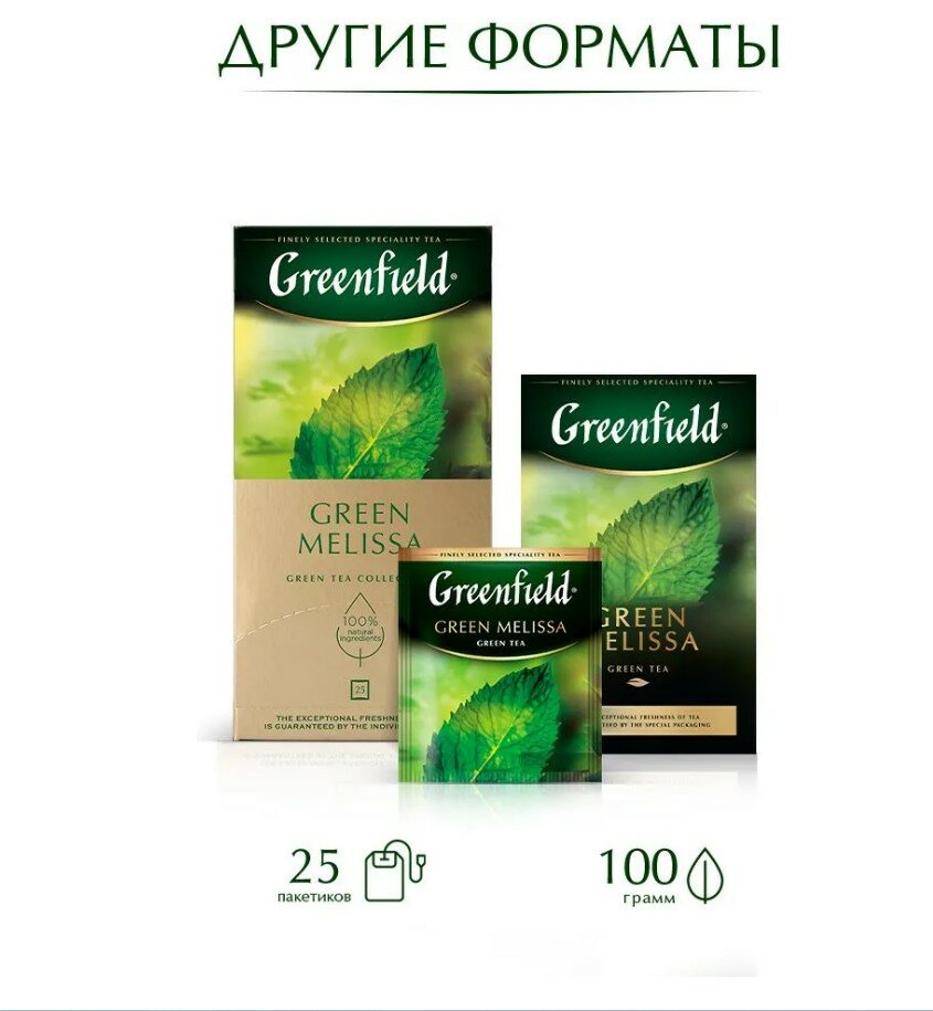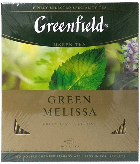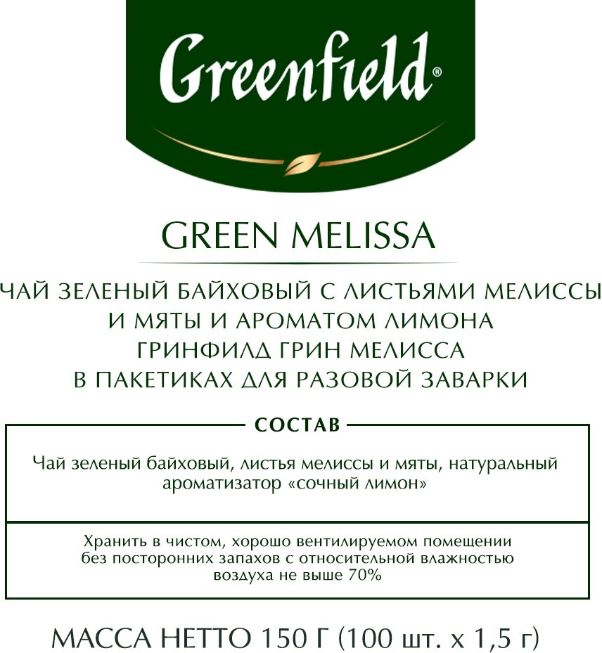 | Состав набора | Гринфилд Грин Мелисса чай зеленый с добавками пакетированный, 100 пакетиков по 1,5 г, в картонной упаковке |