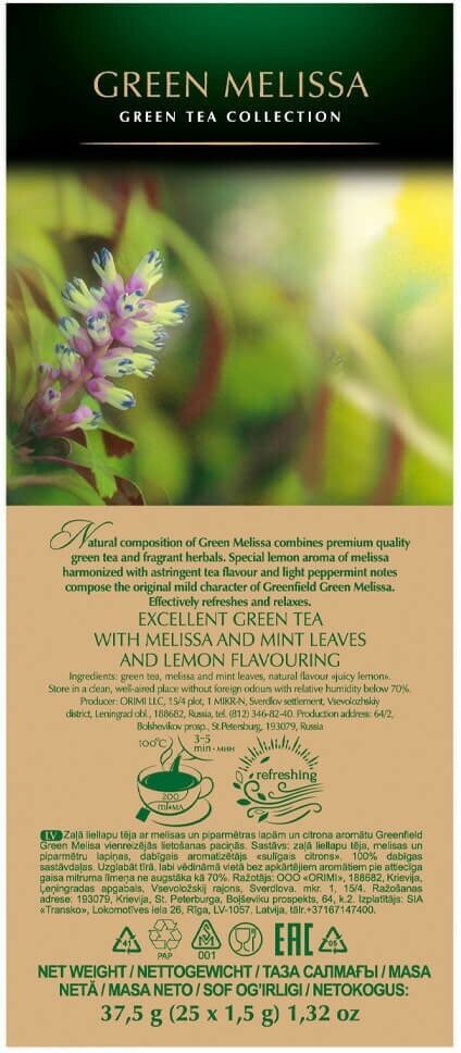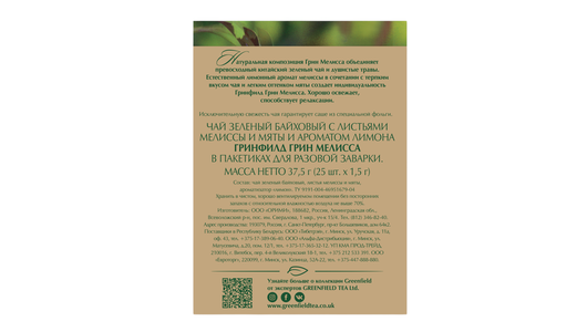 | Состав набора | Гринфилд Грин Мелисса чай зеленый с добавками пакетированный, 100 пакетиков по 1,5 г, в картонной упаковке |
