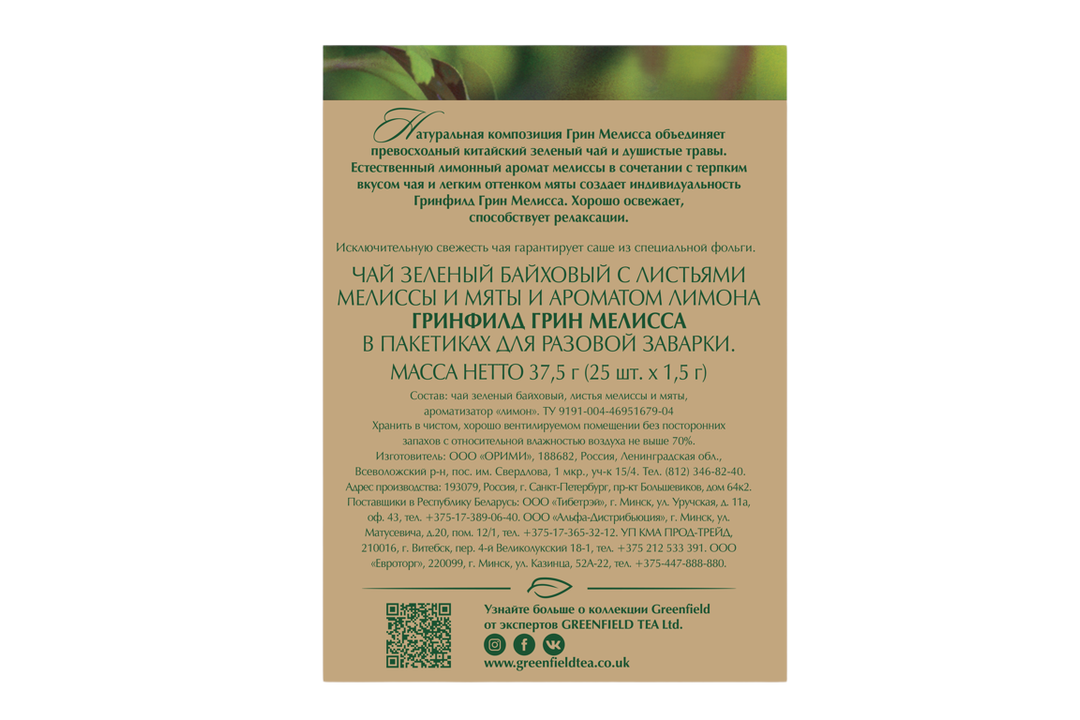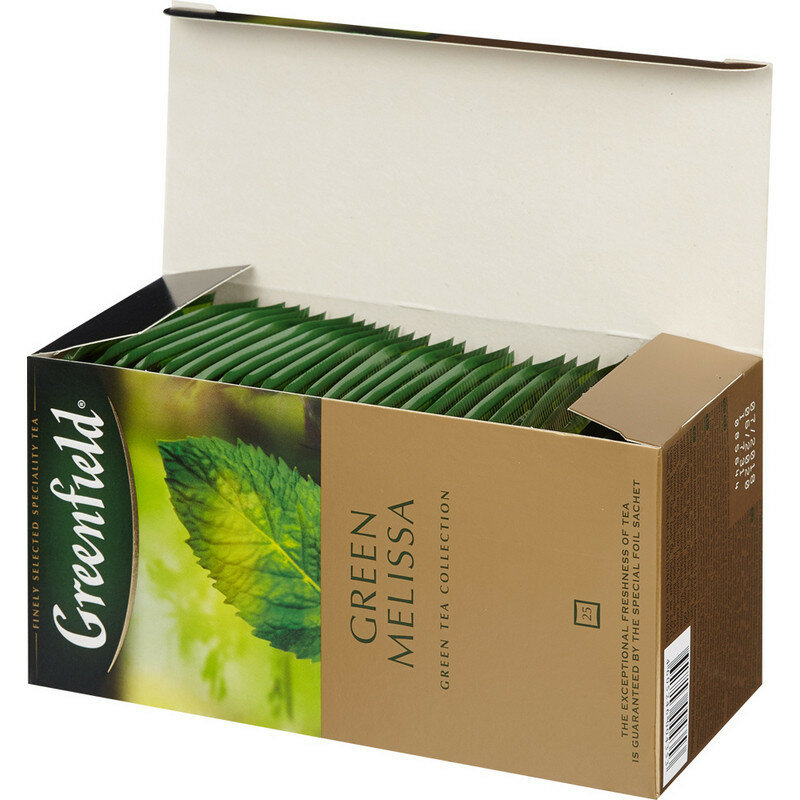 | Состав набора | Гринфилд Грин Мелисса чай зеленый с добавками пакетированный, 100 пакетиков по 1,5 г, в картонной упаковке |