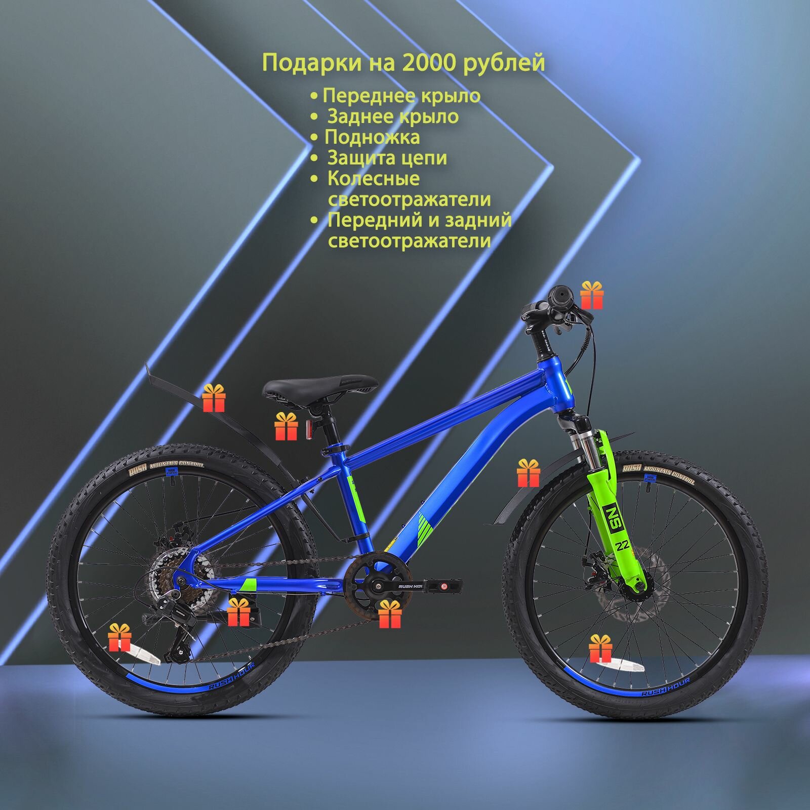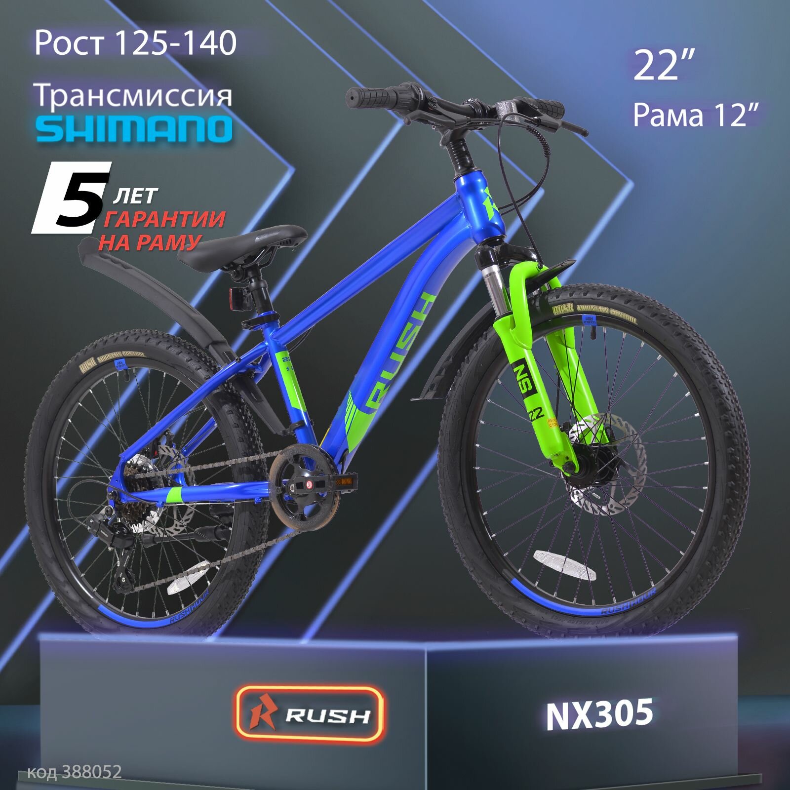 Купить Велосипед детский горный дисковый 22" рост 125-140см 6 скоростей синий рама 12" велик 9 лет 7 лет 8 лет переключатель SHIMANO скоростной RUSH HOUR NX 305