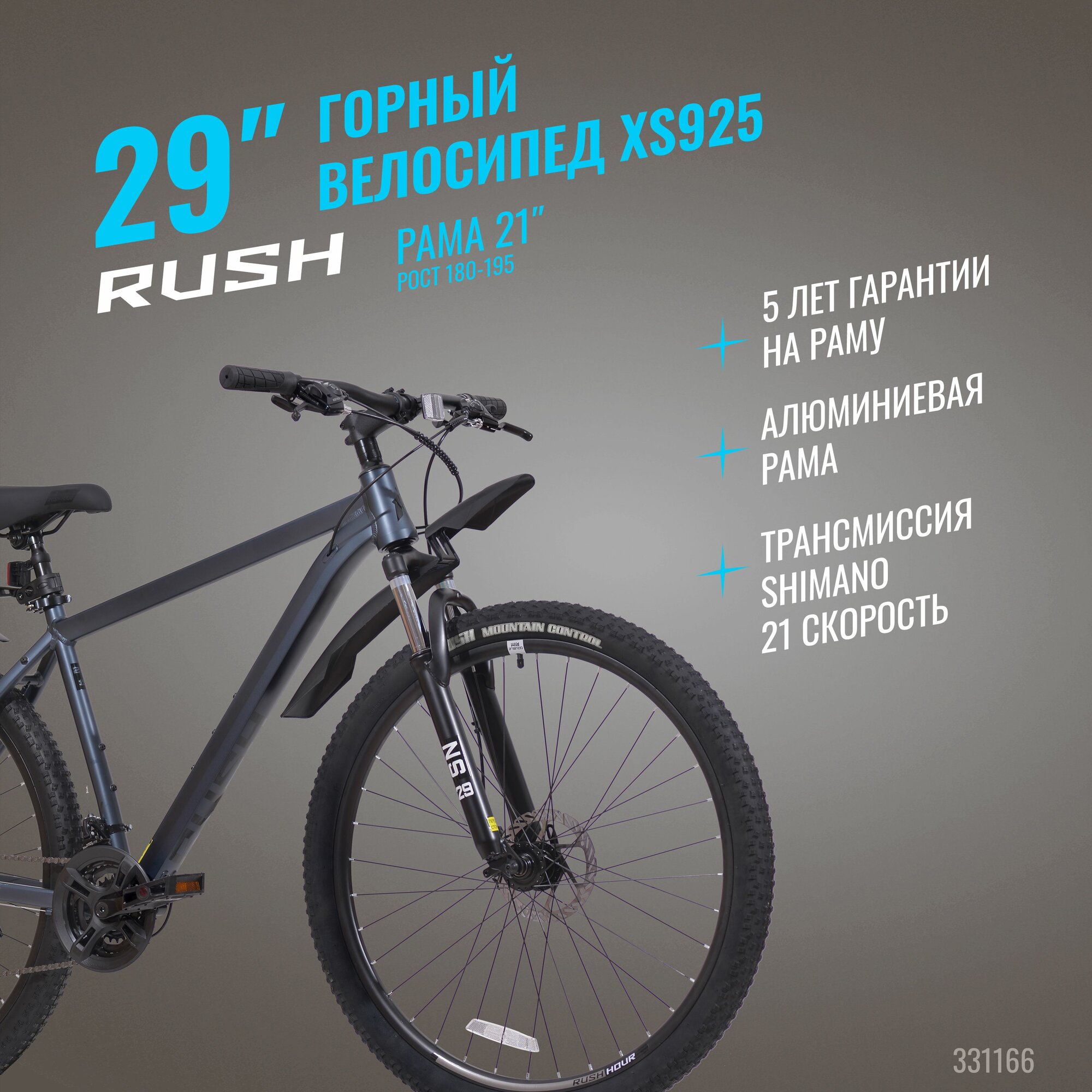 Велосипед алюминиевый взрослый горный 29" RUSH HOUR XS 925 21 скорость черный рама 19" рост 170-185 см. скоростной для мужчины спортивный с амортизацией найнер переключатель SHIMANO