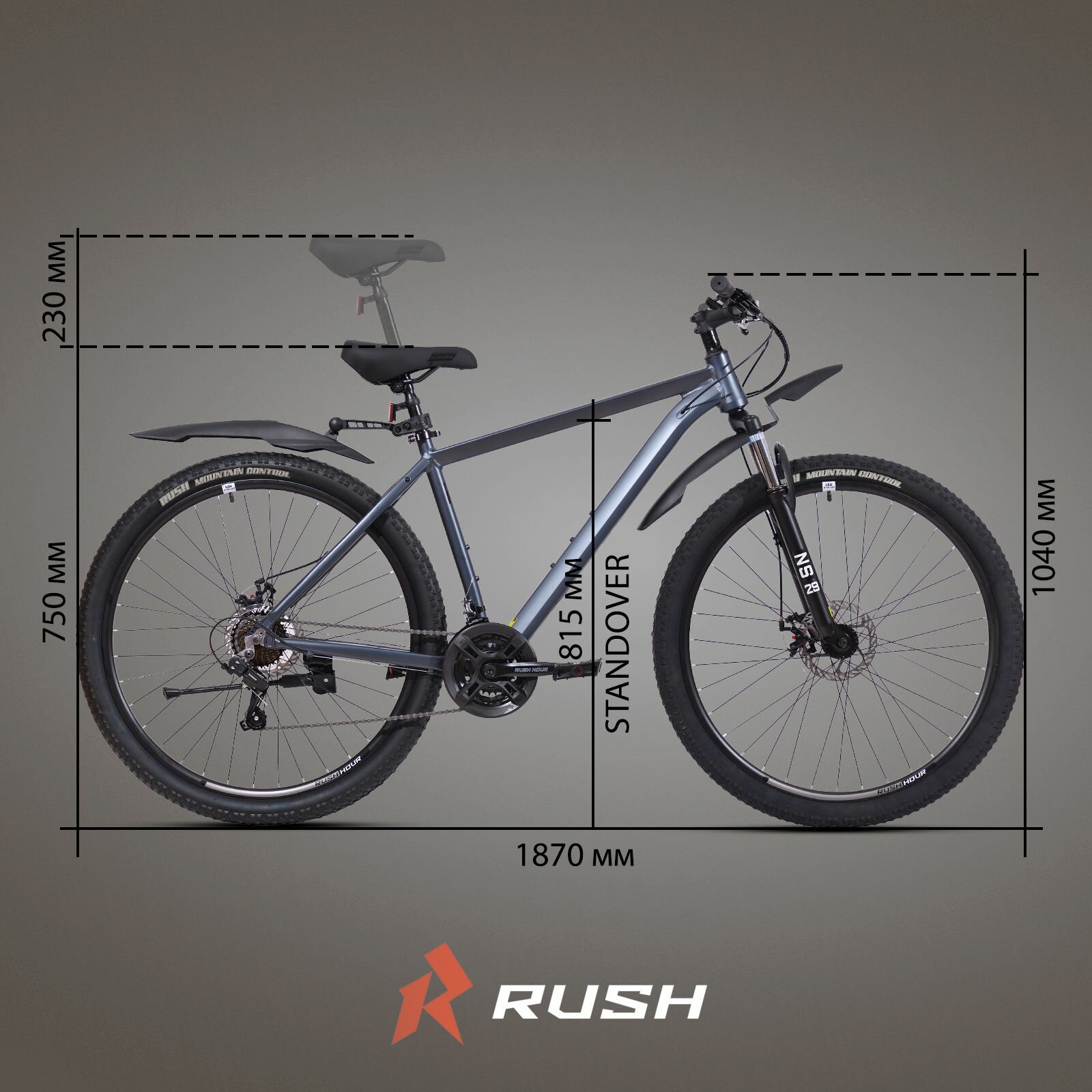 Велосипед алюминиевый взрослый горный 29" RUSH HOUR XS 925 21 скорость серый рама 23" рост 190-210 см. скоростной для мужчин спортивный с амортизацией найнер переключатель SHIMANO дисковый