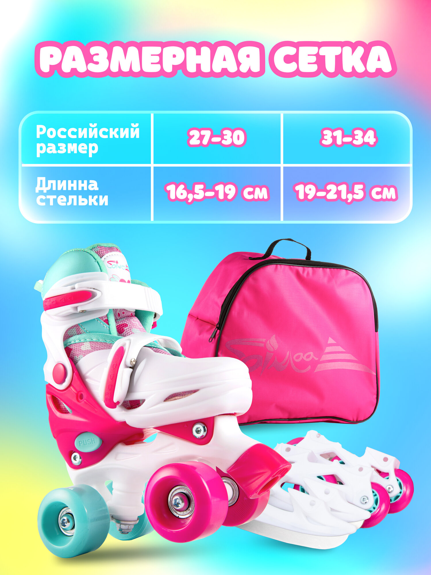 | Особенности | коньки-ролики, раздвижные, с тормозом, сумка-переноска в комплекте |