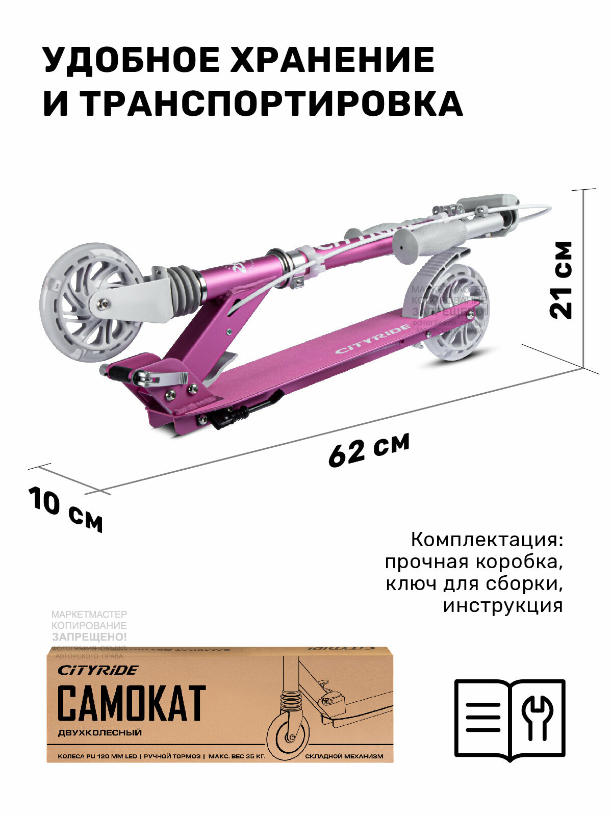 Самокат двухколесный ТМ CITYRIDE, складной, колеса светятся PU 120/120, ручной тормоз, подножка, CR-S2-09PK1 интересное: