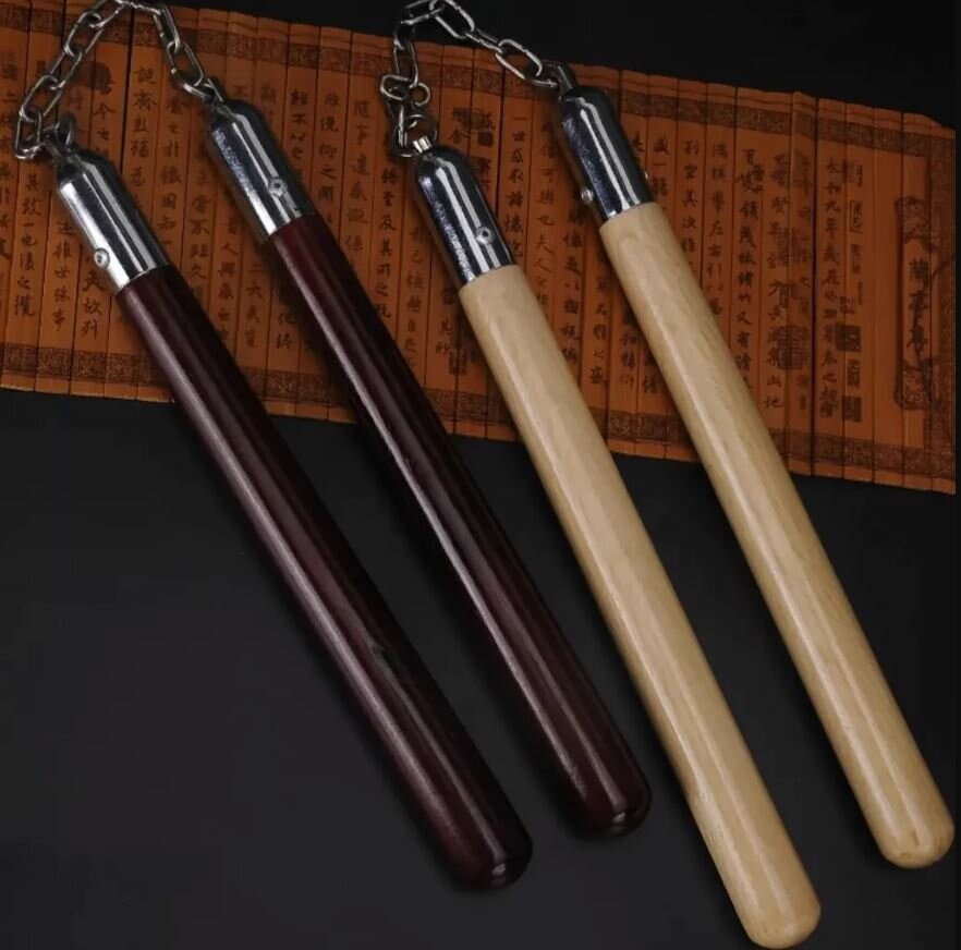 Купить Нунчаки тренировочные 30см деревянные из натурального целого бруса покрытые лаком со стальной цепью и стальными креплениями на шурупах с вращением основания цепи