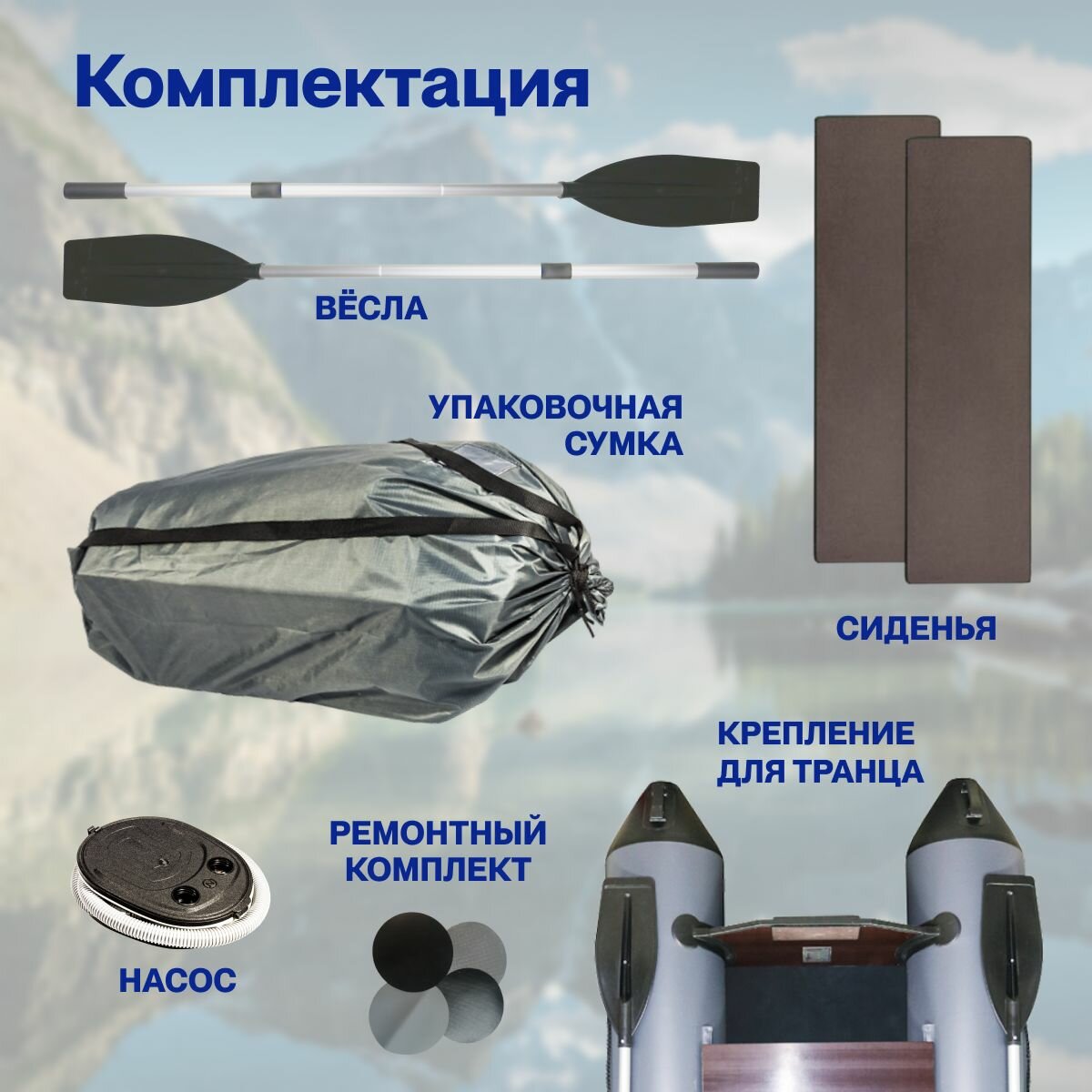 | Комплектация | весла, жесткое сиденье, клапан для слива воды, леерный трос, насос, привальный брус, ремкомплект, ручки для переноски, уключины, якорный рым |