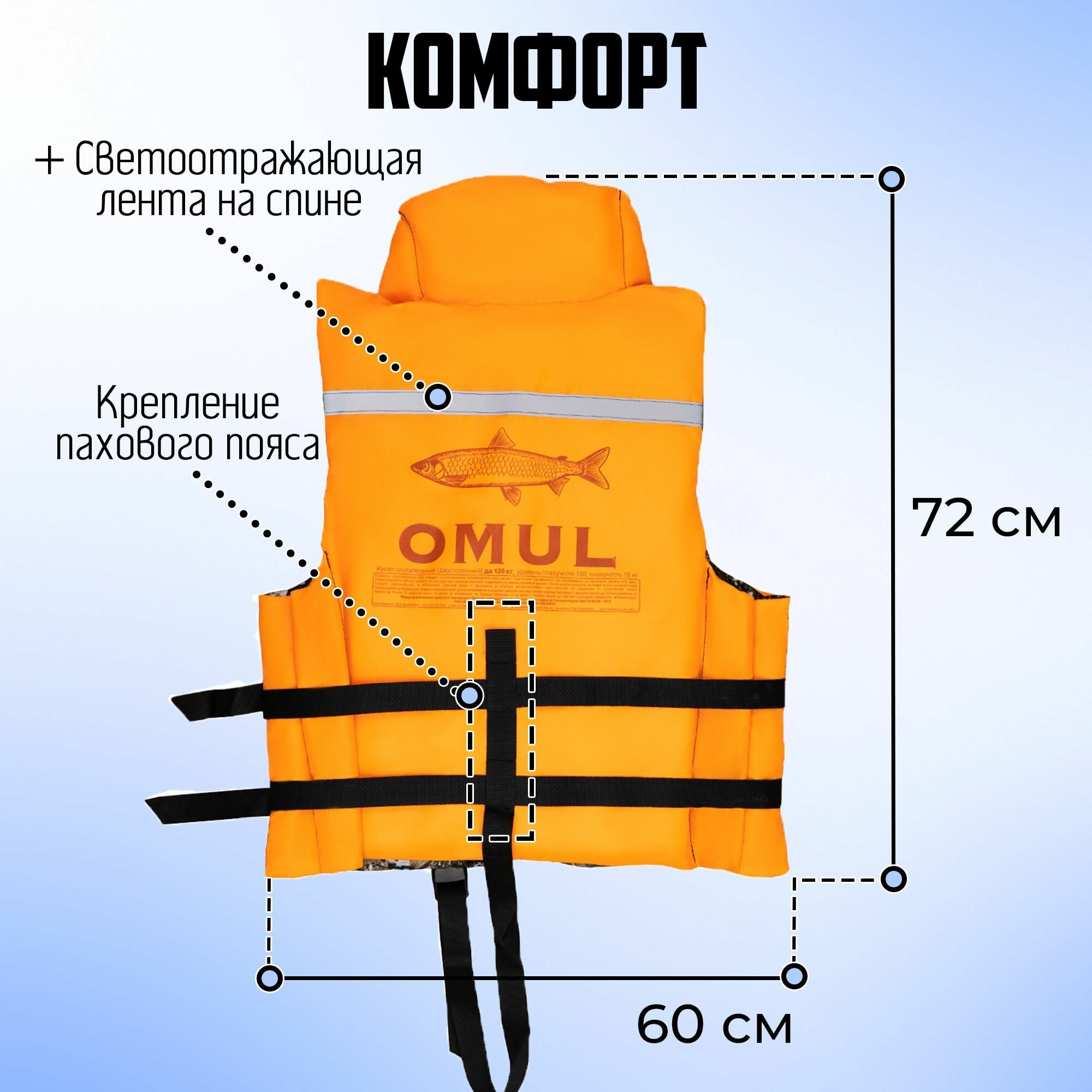 Жилет спасательный OMUL до 120кг двухсторонний интересное: