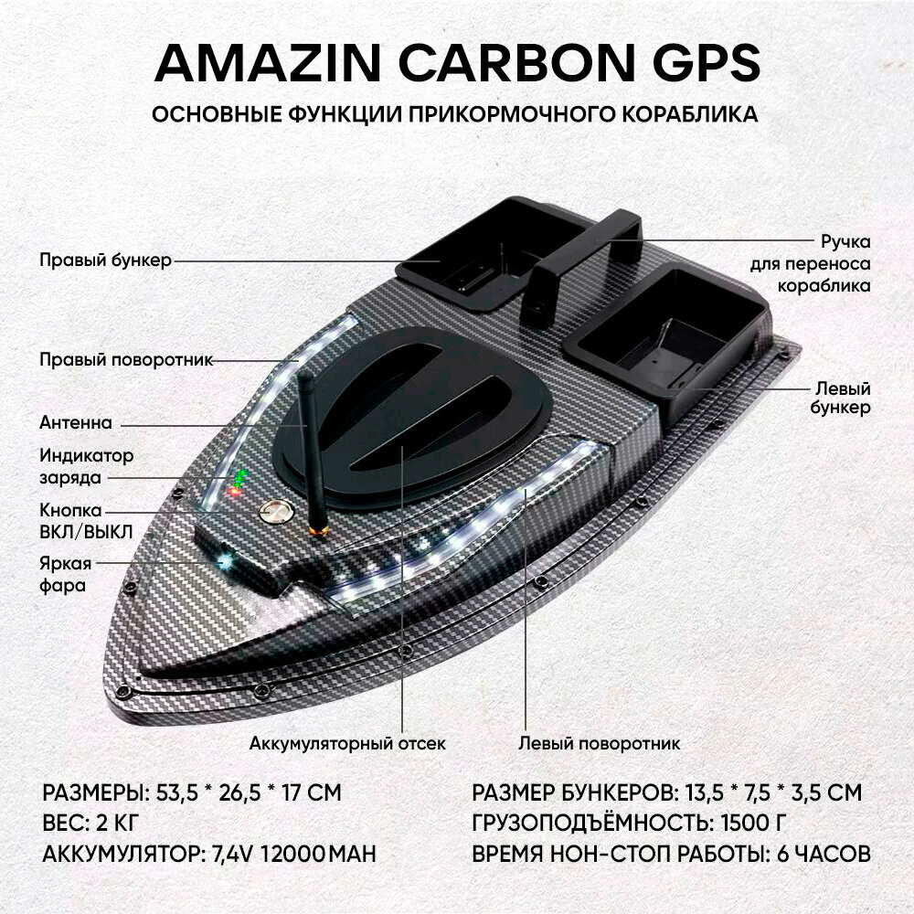 | Дополнительная информация | 1x - Прикормочный кораблик Amazin Carbon GPS 1x - Пульт дистанционного управления 1x - Аккумулятор на 12000 mAh, 7.4 В 1x - Шнур для пульта на шею 2x - Запасные винты 1x - Инструкция на Русском языке 1x - Зарядное устройство 1х - Антенна на кораблик |