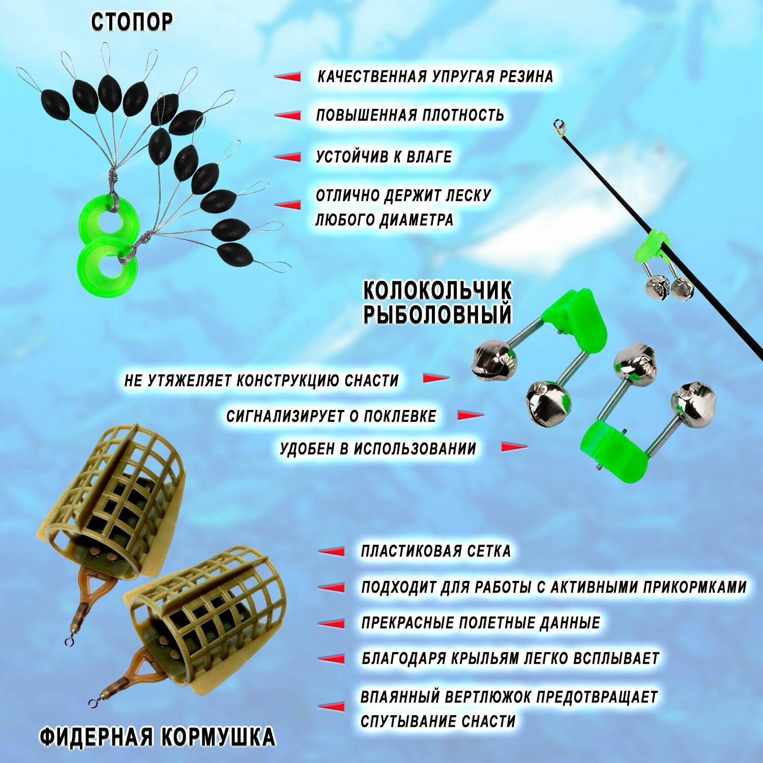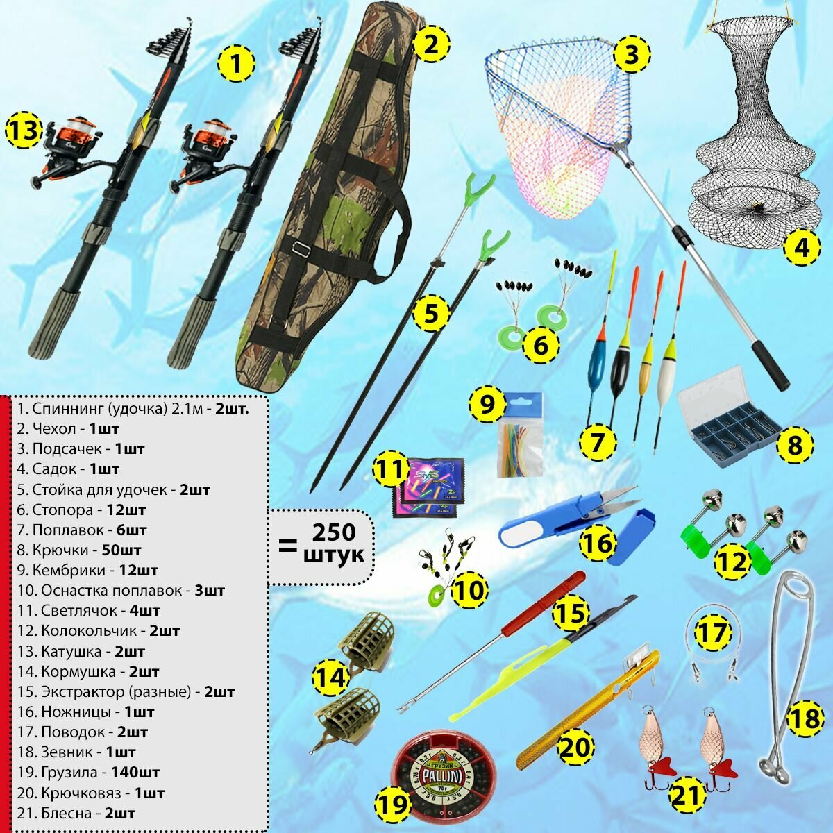 | Дополнительная информация | В наборе: 1. Спиннинг (удочка) 3.0м - 2шт. 2. Чехол - 1шт 3. Подсачек - 1шт 4. Садок - 1шт 5. Стойка для удочек - 2шт 6. Стопора - 12шт 7. Поплавок - 6шт 8. Крючки - 50шт 9. Кембрики - 12шт 10. Оснастка поплавок - 3шт 11. Светлячок - 4шт 12. Колокольчик - 2шт 13. Катушка - 2шт 14. Кормушка - 2шт 15. Экстрактор (разные) - 2шт 16. Ножницы - 1шт 17. Поводок - 2шт 18. Зевник - 1шт 19. Грузики 70гр - 140шт 20. Крючковяз - 1шт 21. Блесна - 2шт |