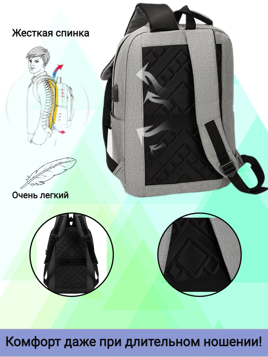 | Конструктивные особенности | USB-выход / анатомический / боковые карманы / вентилируемые лямки / вентиляция спины / внутренний карман / две лямки / перегородка в основном отделении / ремешок крепления ноутбука / ручка сверху / фронтальный карман / эргономичные лямки |