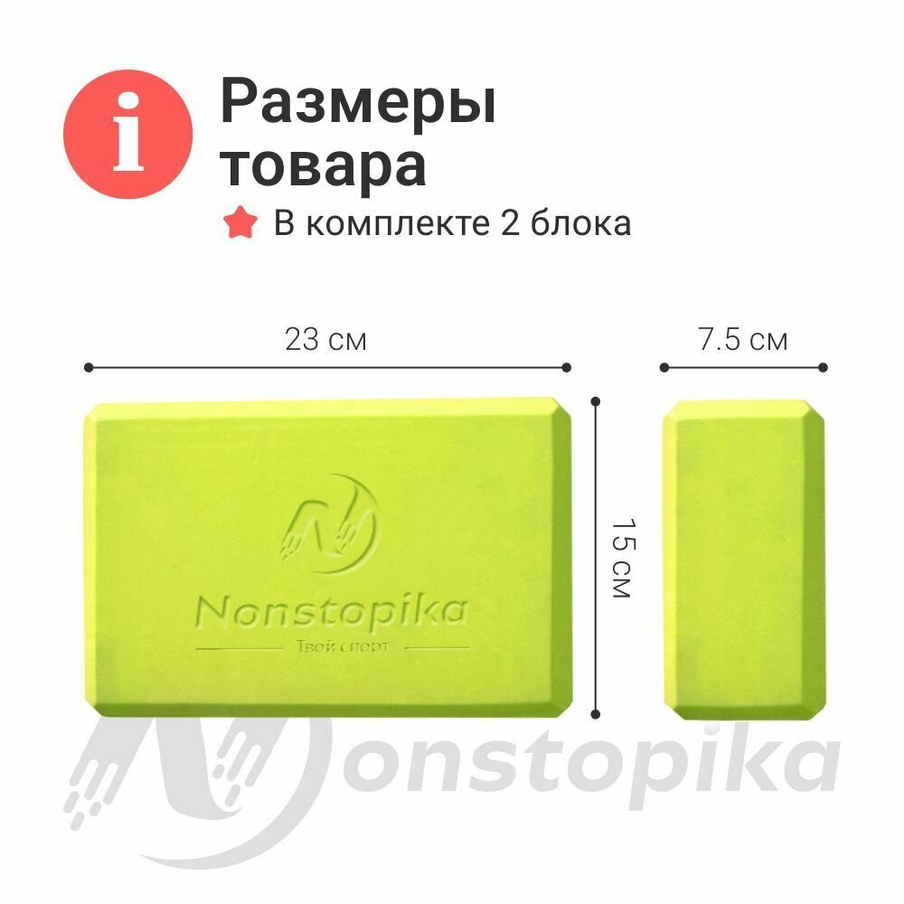 Блок для йоги/Кирпич спортивный/Блок для фитнеса/Опорный блок /Кубик для йоги и пилатеса Nonstopika 23х15х7.5см зеленый, опорный кирпич, 2 штуки